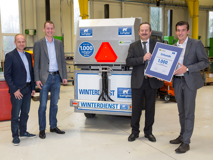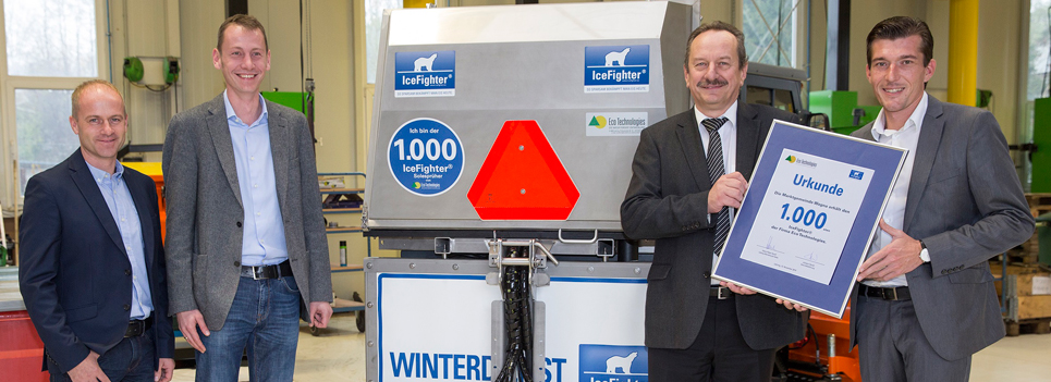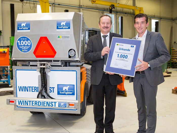 Der österreichische Hersteller für kommunale Anbaugeräte verfügt über 14 Jahre Erfahrung im Bereich der Soletechnik und übergibt jetzt seinen 1.000sten Solesprüher „IceFighter“ an die Gemeinde Wagna. Durch den Einsatz des „IceFighter“ lässt sich der Winterdienst wirtschaftlich, effizient und umweltschonend verrichten. Im Gegensatz zu Splitt verursacht Sole (in Wasser gelöstes Salz) keinen Feinstaub und wirkt länger auf der Fahrbahn. Beim Solesprühen wird bis zu 75% weniger Salz als bei Trockenstreuung benötigt und ein präventiver Einsatz gegen Glätte und Eis ist möglich. Die Gemeinde Wagna aus dem Bezirk Leibnitz, in Österreich, setzt bereits seit fünf Jahren erfolgreich IceFighter Solesprüher von Eco Technologies im Winterdienst ein und konnte bisher eine Einsparung von rund 125.000 € verzeichnen. Der neue IceFighter soll Wagna zu weiteren Ersparnissen und Vorteilen bei der Verrichtung des Winterdienstes verhelfen.
