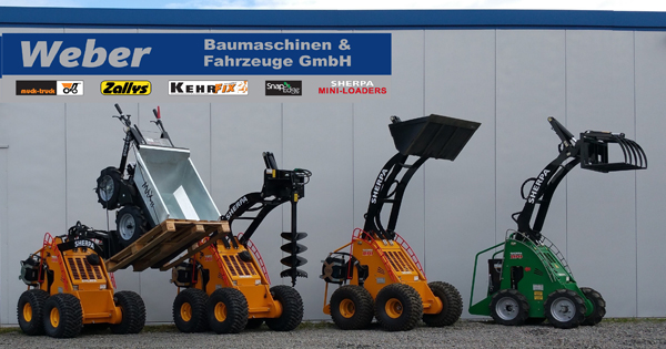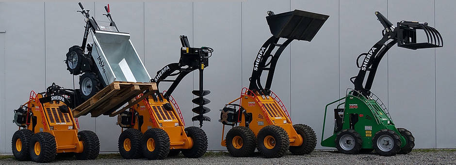 Für Baustellen mit einer Emissionseinschränkung in puncto Lärm oder Abgase steht der Sherpa 100 als Elektroversion zur Verfügung, der einen Akkubetrieb von bis zu 8 Stunden ermöglicht. Der Sherpa 100 ist nicht nur der kleinste Minilader der Welt, sondern auch der erste mit Wechselakku. Anbaugeräte wie z.B. Hydraulikhämmer, Hydraulikgreifer, Fräsen, Kehrmaschinen, Greifschaufeln oder Erdbohrer machen ihn zu einer vielfältig einsetzbaren Multifunktionsmaschine. Selbst ein Dumper oder ein Mischer kann angebaut werden. Damit reicht sein Leistungsspektrum in alle nur erdenkliche Segmente des Bauens hinein.