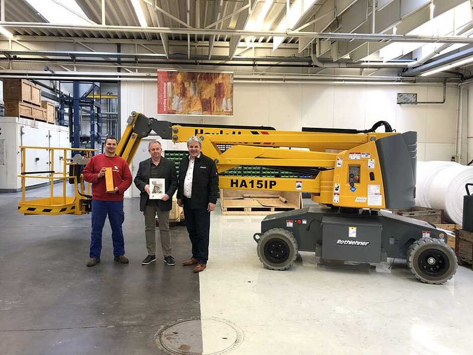 Bernhard Spörk, seit 25 Jahren für Rothlehner Österreich tätig, übergab die neue HA15IP an die Vertreter des Kunden, Johann Rauscher und Gerald Fuchs. Außerdem überreichte Spörk eine Urkunde von Rothlehner sowie eine Flasche Champagner von Haulotte. In erster Linie für die interne Instandhaltung wird die Jubiläumsbühne HA15IP, inklusive diverser Sonderausstattungen, verwendet. Die Zusammenarbeit zwischen Haulotte und Rothlehner, sowohl im Vertrieb als auch im Service, soll weiter vertieft werden.