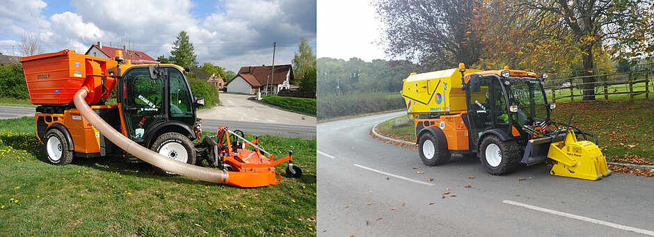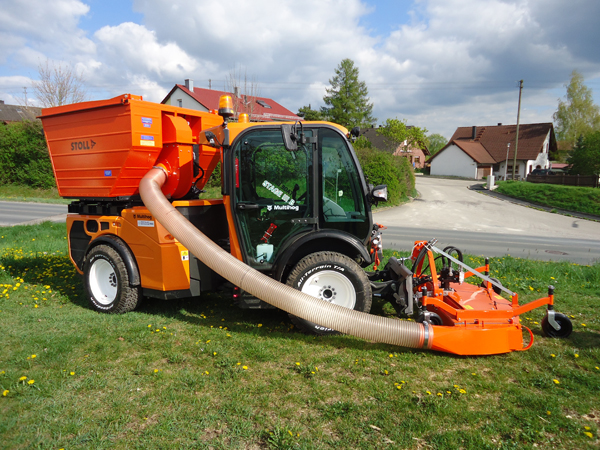 Das zweite, neue Anbaugerät ist die Stoll Einheit. Es besteht aus einem frontmontierten Sichelmäher und einem großen Auffangbehälter am Heck mit einem Saugschlauch, der gleichzeitig das gemähte Gras in den Auffangbehälter nach Hinten saugt. Der robuste Mäher hat eine stabile Bauweise. Der Mäher ist mit drei kräftigen Messern ausgestattet und ist auch werkzeuglos höhenverstellbar. Der 2200 Liter Hoch-Kipp Auffangbehälter ist hinten auf dem Multihog montiert und hat dabei eine kurze Baulänge. Durch einen geringen Geräuschpegel (80dB), günstigen Kraftstoffverbrauch und einfache Entleerung ist es somit das effizienteste Mähsystem dieser Art. Siehe es in Aktion <link https: www.youtube.com>hier