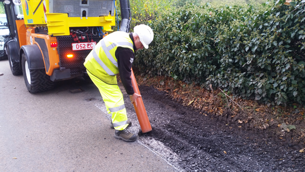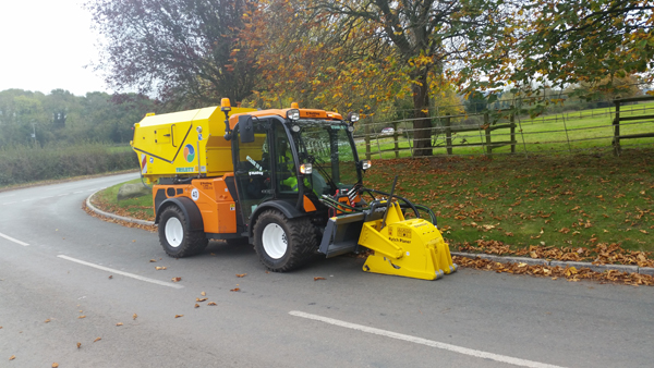 Die neue heckmontierte Kehrmaschine kommt von der Trilety GmbH und kann in mehreren, verschiedenen Weisen benutzt werden. Britische Kunden betreiben es mit einer vormontierten Asphaltfräse, um Schlaglöcher zu reparieren. Schlaglöcher werden zuerst abgefräst und lassen Asphaltgranulat hinter sich. Das Asphaltgranulat muss bevor das Schlagloch wieder versiegelt wird aufgesammelt werden. Diese effiziente Kehrmaschine sammelt das durch den Fräsprozess gewonnene Asphaltgranulat in den heckmontierten Auffangbehälter, entweder mit den heckmontierten Bürsten oder über einen Handlaufschlauch (oben rechts) für eine präzise und gründliche Reinigung. Nachdem das gesamte Asphaltgranulat aufgesammelt ist fährt der Multihog dann zu einem bereitstehenden Lastwagen, und entleert den Inhalt des Auffangbehälters in den Lastwagen.