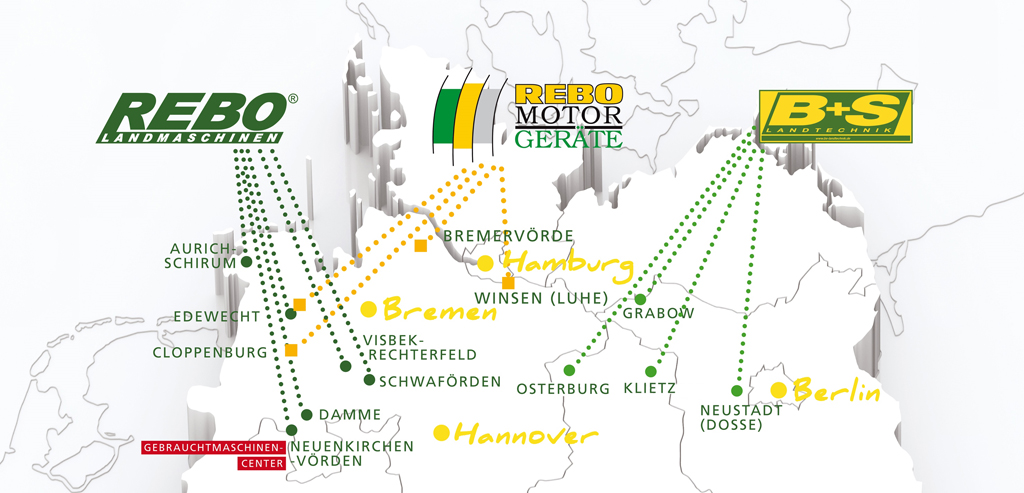 In den sechs Standorten Visbek-Rechterfeld, Aurich-Schirum, Damme-Borrinhausen, Edewecht Neuenkirchen-Vörden und Schwaförden stellen sich engagierte Mitarbeiter – darunter zahlreiche Auszubildende - den Anforderungen der Kundschaft. Neben den Vertriebs- und Serviceleistungen für Land-, Bau- und Industriemaschinen bietet Rebo auch einen Umbau von Traktoren zum Geräteträger für Kommunal- und Wasserwirtschaft an.