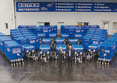 Beyer Mietservice ist ein „Komplettvermieter“, bei dem der Kunde alle für eine Baustelle notwendigen Maschinen aus einer Hand mieten kann. Erhältlich sind neben allen gängigen Baumaschinen auch <link http: www.beyer-mietservice.de teleskopstapler_mieten-6.html _self>Teleskopstapler, Arbeitsbühnen, <link http: www.beyer-mietservice.de stapler_mieten_gabelstapler-9.html _self>Gabelstapler, Minikrane und Eventtechnik. Beyer verfügt über eigene Niederlassungen und Partner in ganz Europa. Bekannt sind die Mietmaschinen von Beyer durch ihre einheitlich blaue Farbe an der auch die neuen Lichtmasten erkennbar sein werden. Das 1994 gegründete Unternehmen beschäftigt heute über 120 Mitarbeiter und zeichnet sich neben dem vielfältigen Angebot an Maschinen auch durch die hervorragende Qualität in Technik und Service aus. Hierfür verfügt Beyer über eigene Werkstätten, die alle anfallenden Service- und Wartungsarbeiten selbst durchführen können, aber auch eng mit den Herstellern und Fachbetrieben zusammenarbeiten, um schnelle Reaktionszeiten zu gewährleisten. Darüber hinaus engagiert sich das Unternehmen in verschiedenen sozialen Projekten wie beispielsweise der Stiftung „Fly and Help“ und dem Deutschen Kinderhospizverein e.V.