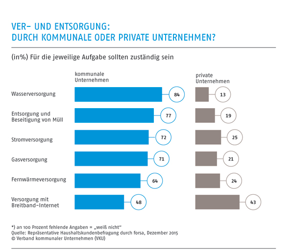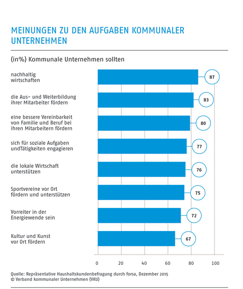 Professor Manfred Güllner, Geschäftsführer des forsa-Instituts, zu den Ergebnissen: „Das Vertrauen zu kommunalen Unternehmen ist sehr hoch: 75 Prozent aller Bundesbürger bringen Ihnen großes Vertrauen entgegen.“ Größer ist das Vertrauen nur zur Wissenschaft (den Universitäten mit 80 Prozent), der Medizin (den Ärzten mit 78 Prozent) und zu den Sicherheitsorganen (der Polizei mit 77 Prozent). „In einer Welt, die immer schneller wird, wo die Globalisierung immer mehr Wirtschaftszweige und Institution erfasst, ist de