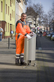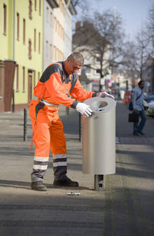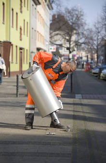 Mutet seine zylindrische Form noch recht konventionell an, so offenbart der Blick zur abgeschrägten Einwurföffnung Gestaltungsmut. Statt der üblichen Rechteck- oder Rundöffnung finden umweltbewußte Bürger entweder eine X-, O- oder D-Form vor. Diese Formensprache kann zum Trennen der Abfallart eingesetzt werden, zumal sie dem Abladen größeren Mülls Einhalt gebietet. Der Behälter fasst 80 Liter und steht mit patentierter 3p-Technologie wackelfest in der ebenerdigen Bodenhülse: Bei Beschädigung muss nur das Verbindungsstück mit Sollbruchstelle ersetzt werden, was schnell vor Ort erledigt wird. Damit ist auch ein kurzfristiges Umsetzen bei Veranstaltungen möglich.