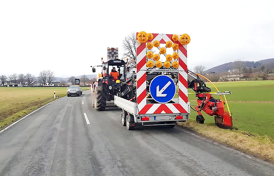 Eine ordnungsgemäße Absicherung der Baustelle ist unerlässlich, um bei Straßenarbeiten die Sicherheit aller Verkehrsteilnehmer sowie die der Arbeiter zuverlässig zu gewährleisten. Die Nissen-Warntafel Typ B mit LED-Blinkpfeil LP 15 für Straßen mit Gegenverkehr bietet hierfür eine bewährte Lösung, die den Vorgaben der RSA und TL entspricht und somit regelkonform absichert. Mit den Maßen 2.500 auf 1.700 mm und dem Verkehrszeichen 616-31 in kleiner Ausführung eignet sich die Warntafel für den Einsatz an Sonderfahrzeugen wie Traktoren oder Geräteträgern, um z.B. während der Mähsaison die Arbeiten sicher und effizient durchführen zu können.