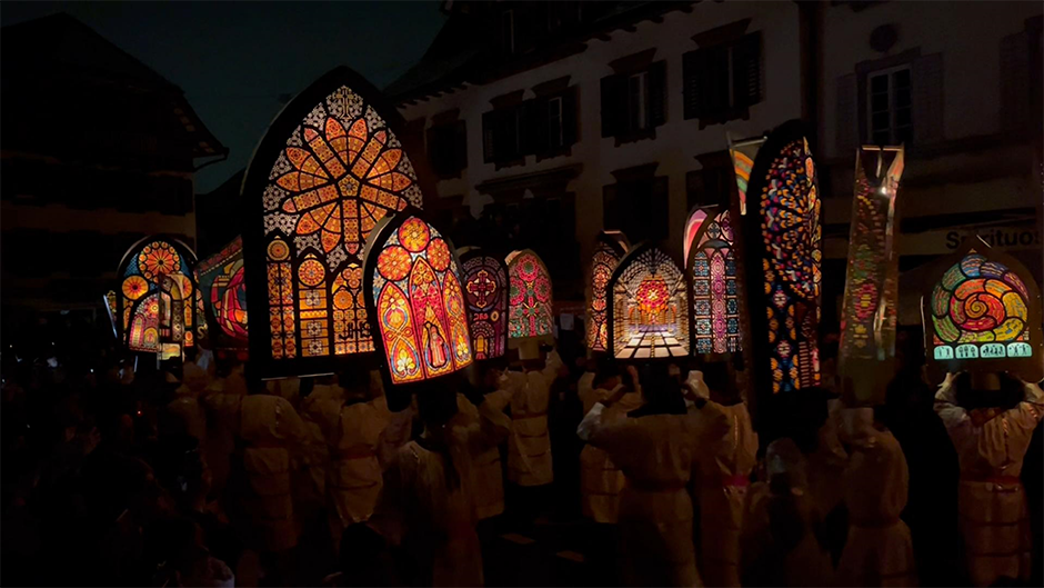 Praktisch, denn es herrschte wieder ein lebhaftes Treiben auf dem Hauptplatz, als die „Geißelklöpfer“ in Gruppen ihre faszinierenden Künste vorführten. Ein ohrenbetäubender Knall und das Löschen der Straßenbeleuchtung markierten den Beginn des Umzugs. Das Knallen der Geißeln und das rythmische Geläute der „Trichlen“(Kuhglocken) schallten durchs Dorf. Fast schon ruhig und poetisch wurde es, als die Träger der bis zu 2,50 Meter hohen Laternen die Straße für sich einnahmen. Die bunten, detailreichen „Iffelen“ gleichen farbenfrohen Kirchenfenstern. Nach dem Umzug wurde die ganze Nacht weitergefeiert. Wer dann noch auf den Beinen war, reihte sich morgens um 6.00 Uhr ins „Sächsizügli“ ein, den abschließenden Umzug.