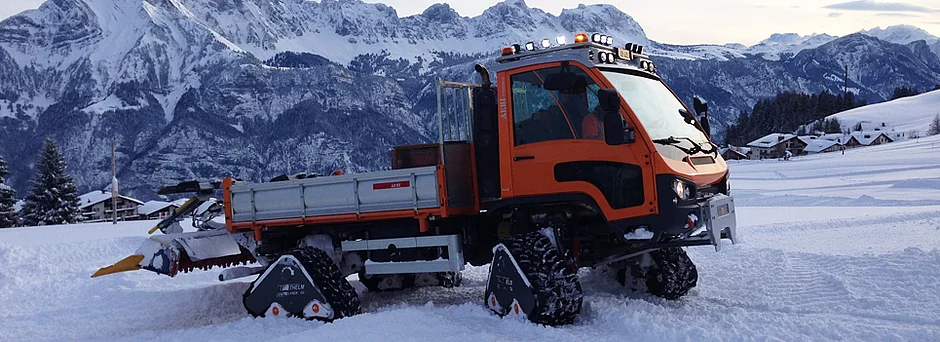 Aebi kam mit dem neuen Raupenfahrwerk bei der Transporter-Reihe einem vielgehegten Kundenwunsch nach. Gerade in besonders anspruchsvollen Bergregionen sind Rad-Transporter bei Schnee oder feuchten Böden schlicht ausser Gefecht gesetzt. Kommunale Dienstleistungen oder Transporte zu Hütten und Bergbahnstationen standen dann oft still. Bis jetzt. Meterhoher Tiefschnee wird nun zur reinen Fahrfreude. Zuverlässig können mit entsprechenden Anbaugeräten, Langlaufloipen oder Schlittelwege gepflegt werden. Auch Transporte zu Skihütten oder Bergstationen werden mit dem Aebi VT 450 Vario mit Raupenfahrwerk komfortabel und effizient ausgeführt – und das mit einem maximalen Gesamtgewicht von bis zu 9.5 Tonnen. Ein weiterer Vorteil des neuen „allrounders“ ist seine Multifunktionalität. Während spezielle Schneemobile nur in den Wintermonaten Verwendung finden, kann beim Aebi VT450 Vario in nur 2 Stunden von Raupen auf Räder umgerüstet werden und das Fahrzeug verwandelt sich in den bisher von Aebi gewohnten Transporter. Mehr Flexibilität, mehr Einsatzmöglichkeiten – 365 Tage im Jahr!