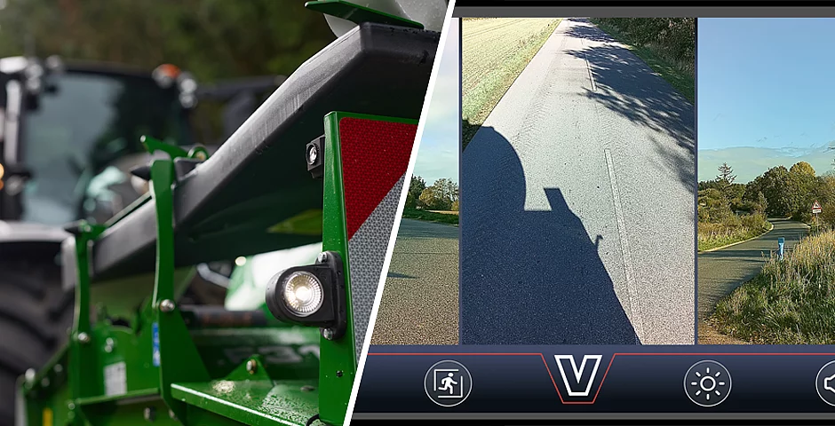VIEW ist ein kamerabasiertes Assistenzsystem für Traktorfahrer, das die Sicherheit sowohl auf der Straße als auch auf dem Feld erhöht. Das System erkennt automatisch den Verkehr vor und hinter dem Traktor – abhängig von der Fahrtrichtung. Es zeigt drei Ansichten: die linke, die rechte und die hintere Kameraperspektive. Wenn der Traktor rückwärtsfährt, schaltet das System automatisch auf die Rückfahrkamera um. Beim Einschalten des Blinkers werden die beiden Frontkameraansichten angezeigt.