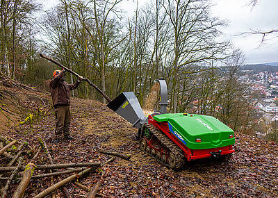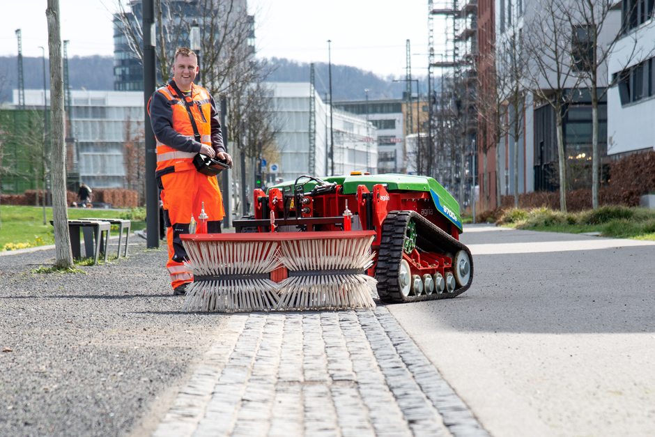Durch das emissionsfreie Arbeiten mit der Funkraupe wird die Gesundheit der Bediener geschont. Dank der reichweitenstarken Funkfernsteuerung sind diese keinen Vibrationen ausgesetzt und müssen sich nicht in den Gefahrenbereich der Maschine begeben. Der Akkubetrieb macht den Einsatz in sensiblen Zonen, wie z. B. in der Nähe von Krankenhäusern, in verkehrsberuhigten Zonen oder Naturschutzgebieten möglich. Auch Schneeräumen in den frühen Morgenstunden ist damit quasi geräuschlos machbar. Durch das für diese Geräteklasse geringe Gewicht der Maschine entsteht wenig Bodendruck und der Untergrund wird geschont.