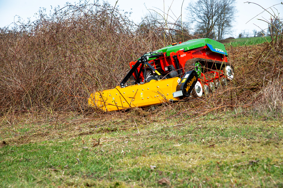 Mit der agria 9700e hat die Agria-Werke GmbH ihr Programm um einen umweltfreundlichen, ferngesteuerten Akku-Geräteträger erweitert. Neben den bereits jahrelang bewährten reinen Mähraupen 9500 und 9600 steht nun eine kraftvolle Maschine für den Ganzjahreseinsatz zur Verfügung. Das Raupenfahrzeug ist hangtauglich und kann bis zu 50 Grad Steigung sicher betrieben werden. Optional erhältliche Raupenbänder mit griffigem AS-Profil gewähren noch höhere Standfestigkeit am Hang. Ein leistungsstarker 24,8 kWh Lithium-Ionen-Akku liefert Energie für bis zu acht Stunden Betriebszeit je nach Einsatz. Durch das sofort verfügbare Drehmoment des Elektromotors macht die 9700e sowohl bei der Arbeitsleistung als auch bei der Beschleunigung eine gute Figur. Zusätzlich gewährleistet die Maschine laut Hersteller im Vergleich zu einem Verbrennungsmotor einen nahezu wartungsfreien Betrieb.