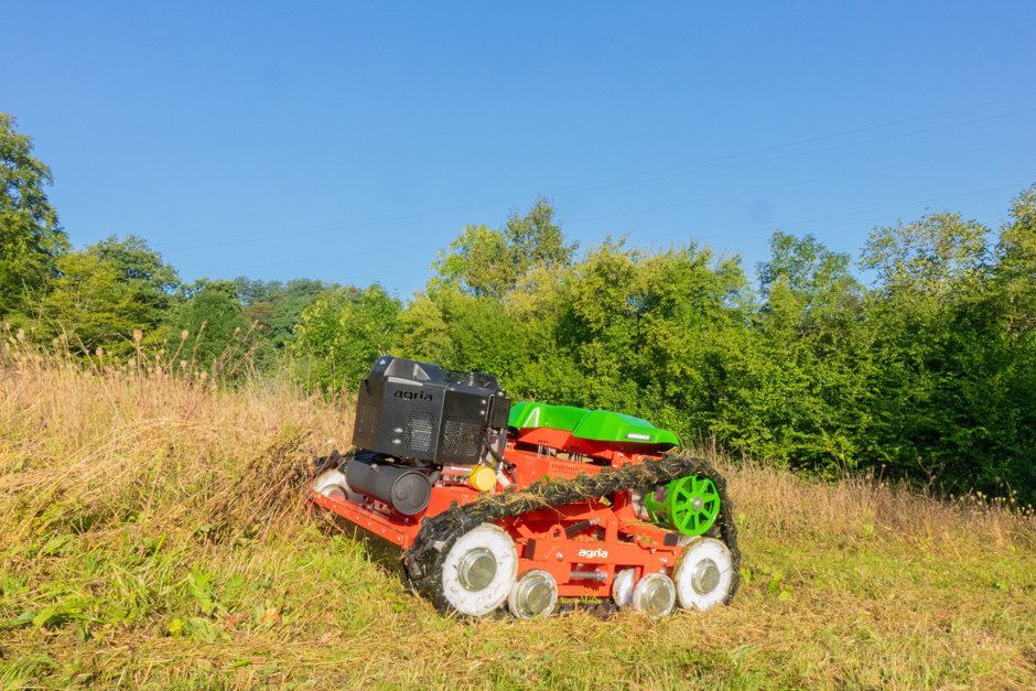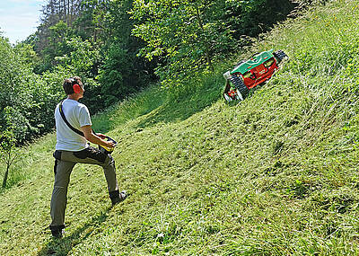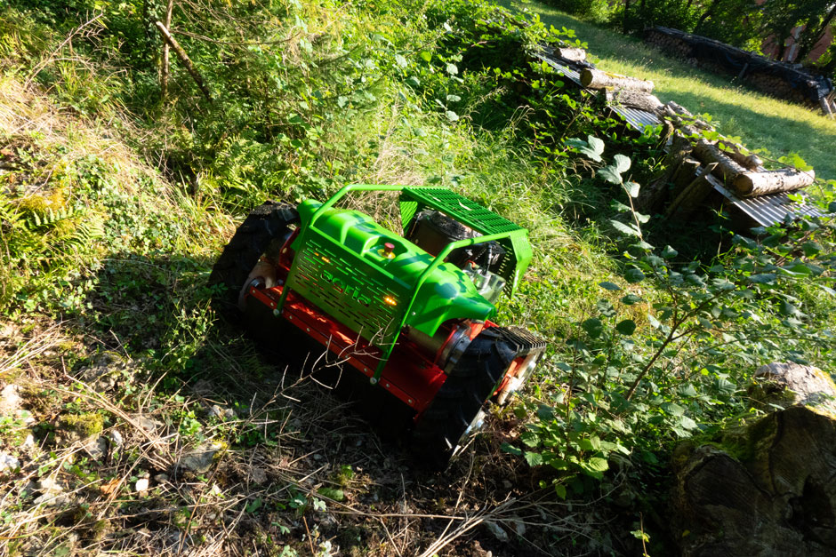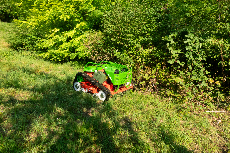 Mit einem 23-PS-Kawasaki-Motor und einer Hangneigung von bis zu 50 Grad lassen sich unwegsame Flächen einfach, sicher und schnell bearbeiten. Eine Fernbedienung mit Neigungssensor bietet Bedienern jederzeit Schutz vor direkten Belastungen wie Vibration, Lärm und Abgas.