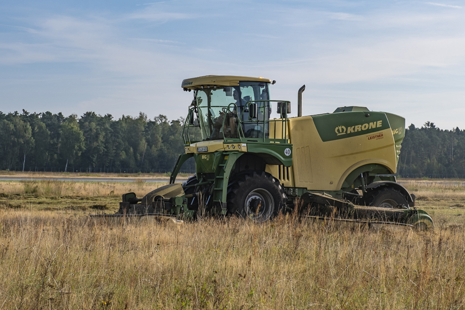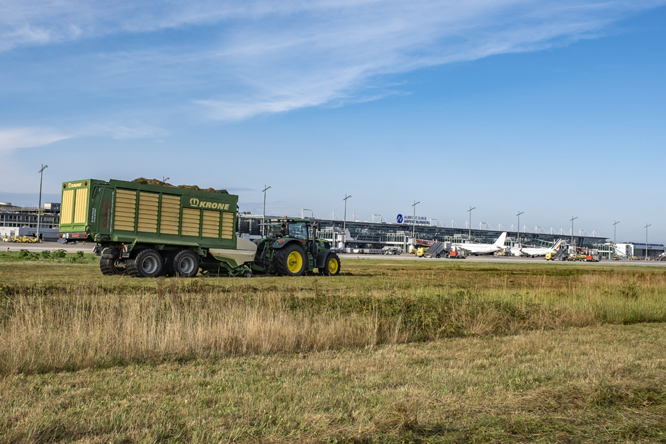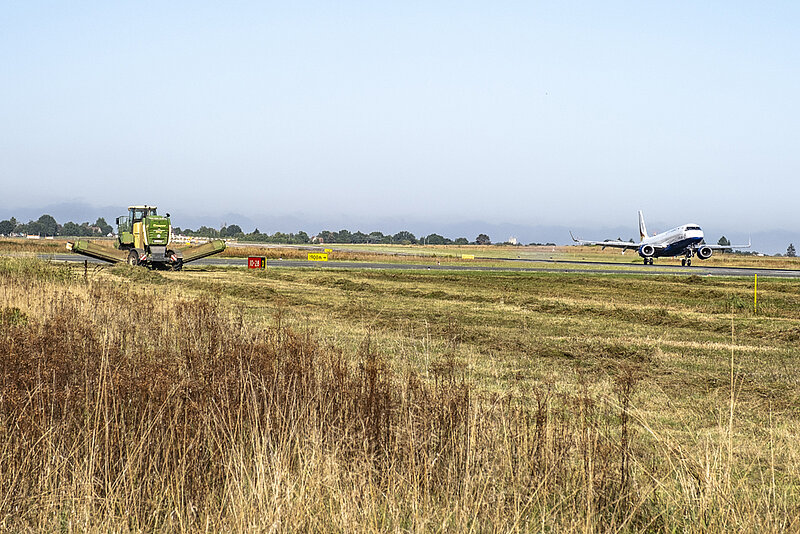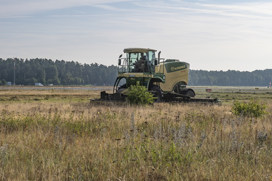 Überwiegend besteht der Bewuchs rund um das Rollfeld bis zu den Zäunen aus wilder Heide. Dies ist in der fränkischen Region eher selten, weshalb das Flughafengelände als Rückzugsort für Flora und Fauna gilt. „Für den Flugbetrieb sind größere Vögel wie Bussard und Habicht aber gefährlich, weshalb sie sich hier möglichst nicht direkt ansiedeln sollten“, legt Heinz Huber, Leiter Infrastruktur am Albrecht Dürer Airport Nürnberg, dar. Die Vögel jagen gerne Mäuse, müssen diese dafür aber auch gut ausmachen können – etwa auf einer frisch gemähten Wiese. „Damit die Grünflächen nicht verbuschen, mähen wir sie zweimal pro Jahr, aber im Hochschnitt auf ca. 20 cm. So kann sich die Maus trotzdem noch gut verstecken, wodurch unser Gelände für Greifvögel weniger attraktiv ist.“