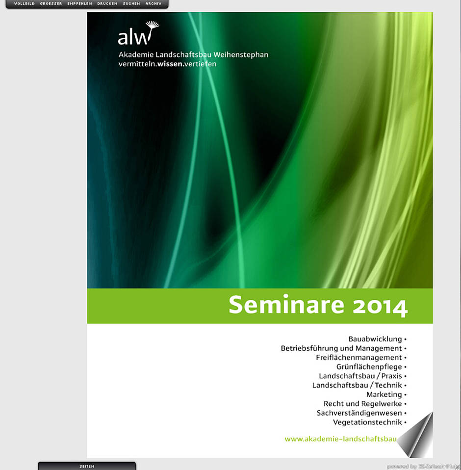 Auf 80 Seiten ist das aktuelle Veranstaltungsprogramm der Akademie Landschaftsbau Weihenstephan GmbH wieder prall gefüllt mit Seminaren und Lehrgängen. Seit kurzem gibt es das Programm auch als praktisches E-Paper.