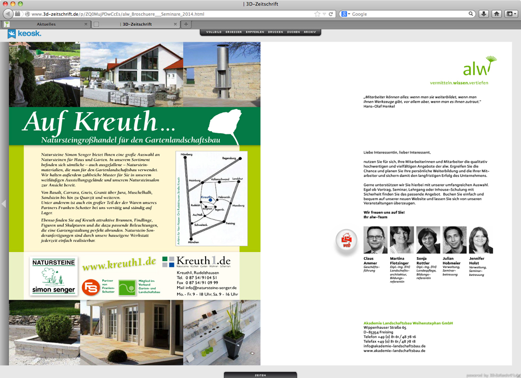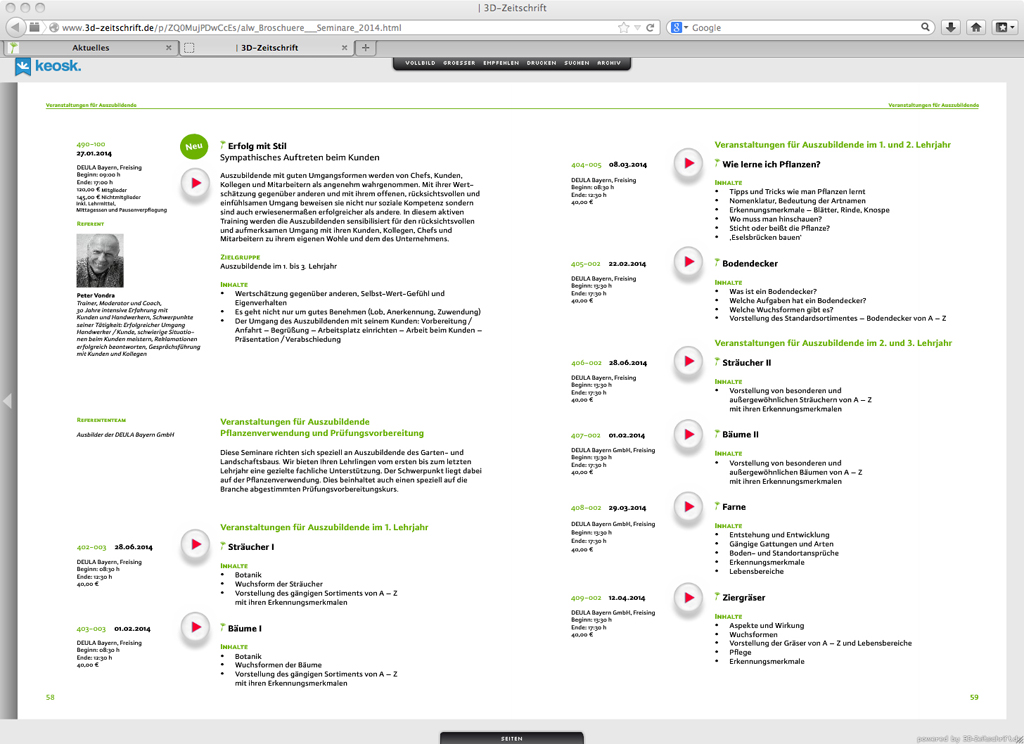 Das E-Paper lässt sich mit der App „Keosk“ sogar mit dem Tablet oder Smartphone von unterwegs blättern. Das Beste: Hat man sein Wunschseminar gefunden, gelangt man mit einem Klick direkt auf die Homepage der Akademie (www.akademie-landschaftsbau.de) und kann dort buchen.