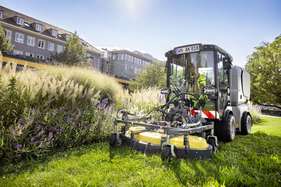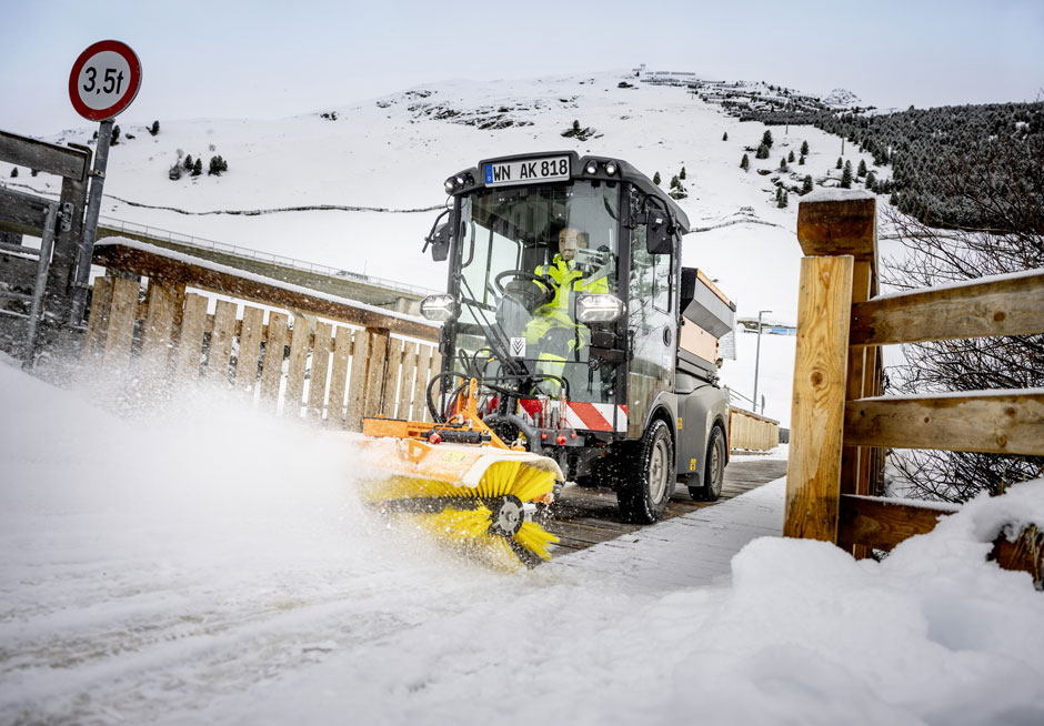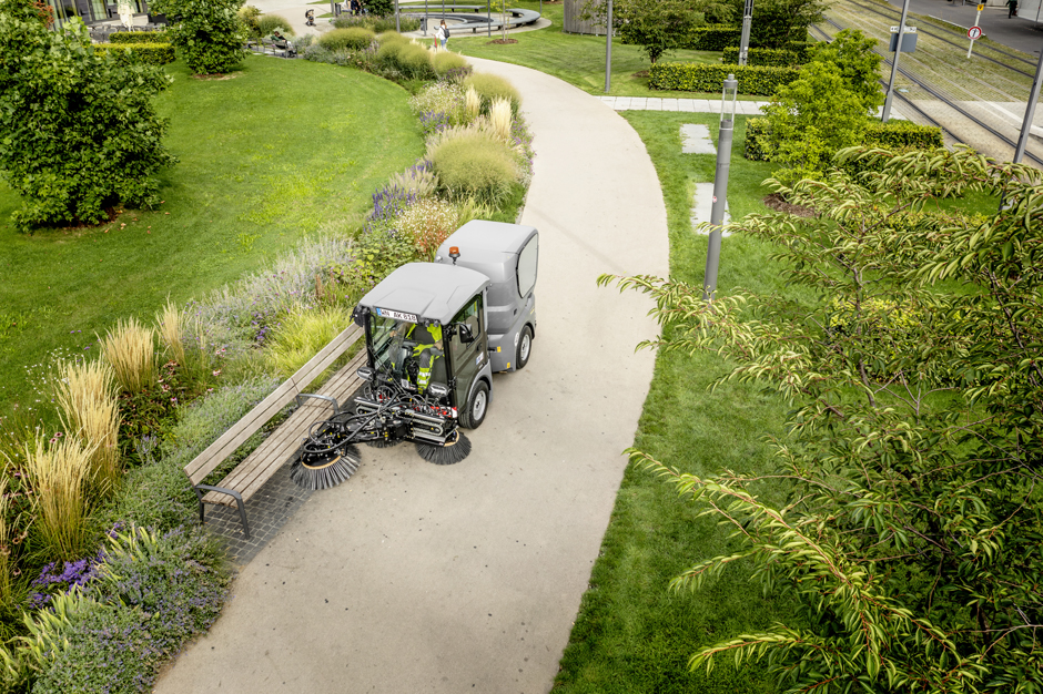 Neu ist die aktive hydropneumatische Federung, mit der sich das Fahrzeug an die Betriebs-Last anpassen kann und der Fahrkomfort immer gleichbleibt. Das bewährte Zwei-Besen-System wird durch ein Parallelogramm geführt und sorgt dafür, dass die Kehrbesen immer eben auf der Straße aufliegen. Vom Mähwerk bis zur Schneefräse lässt sich die MC 150 wie ein Geräteträger mit verschiedenen Anbaugeräten ausstatten.