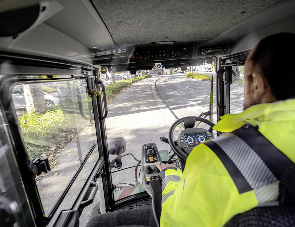 Auch die Doppelsitzer-Kabine ist auf Ergonomie ausgelegt und anwenderfreundlich gestaltet. Sie bietet einen beidseitigen Ein- und Ausstieg mit großen Schiebefenstern in den Türen. Eine beheizbare Frontscheibe bringt freien Durchblick bei schlechten Wetterverhältnissen, und die 360-Grad-Verglasung mit Sicht nach hinten sorgt für einen guten Überblick und Sicherheit beim Manövrieren. Das Multifunktionsdisplay befindet sich in der Lenkradnabe und somit jederzeit im Blickfeld des Fahrers, das Bedienterminal ist komfortabel in die Armlehne eingebaut. Mit nur einem Knopfdruck lässt sich die MC 150 in Arbeitsstellung bringen.