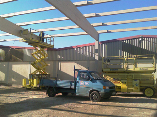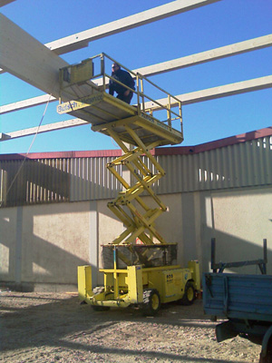Beim Bau des Hallendachs mussten Holzleimbinder montiert werden, um mehrere Holzbalken zu einem Dachträger zusammenzufügen. Da die Plattform der Scherenbühne 5390RT zu beiden Seiten noch ausgeschoben werden kann, hatten die Mitarbeiter der Firma Falk Holzbau 6,6 Meter Aktionsraum, ohne die Bühne versetzen zu müssen. Mit einer Tragkraft von 680 Kilogramm auf dem Hauptteil der Plattform und 227 Kilogramm auf den Ausschüben bestand zudem die Möglichkeit, viel Material mit nach oben zu nehmen.
