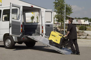 Speziell für Gebäudereinigungsfirmen, Bäckereien oder Kurierdienste wurde die Einbaurampe vom Typ RRK entwickelt. Die leichte Bedienbarkeit beschleunigt die Abläufe bei häufigem Be- und entladen. Gaszylinder gewährleisten einen geringen Kraftaufwand beim Bedienen. Die gelochte Fahrfläche bietet eine hohe Rutschsicherheit und durch die Lochung kann Regen, Schnee und Schmutz schnell entweichen. Während der Fahrt steht die Rampe senkrecht und wird durch entsprechende Verschlusssicherungen gehalten.