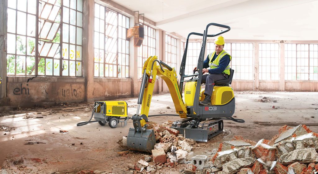 Die Formel für emissionsfreies Baggern von Wacker Neuson = Bagger 803 mit dual power Option + elektro-hydraulisches Aggregat HPU8.