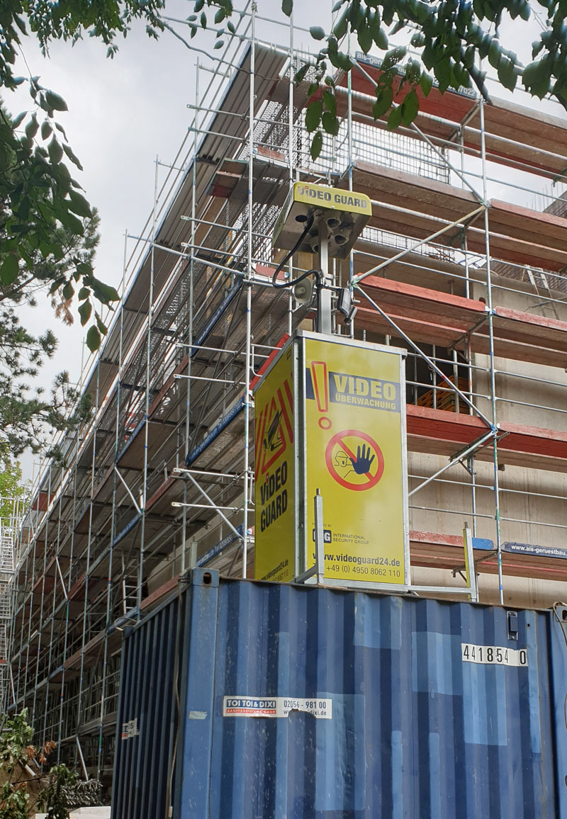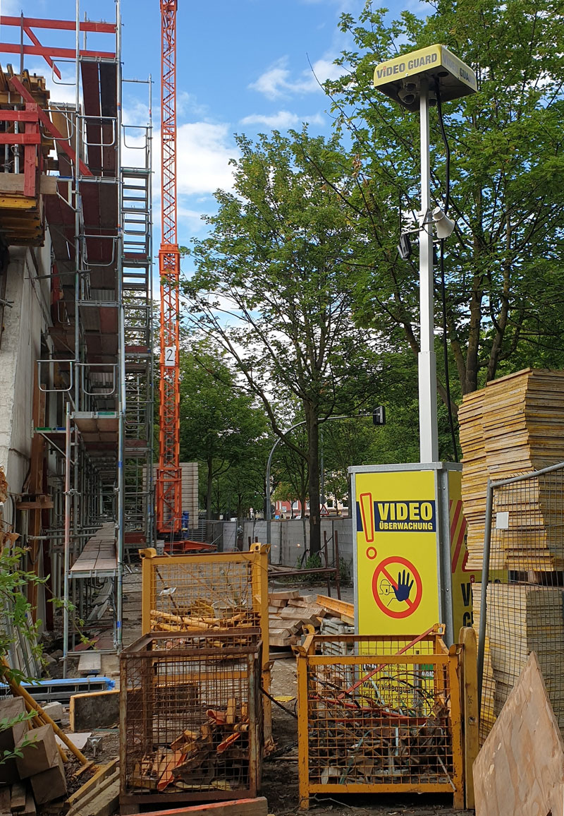 Der Bauprozess soll voraussichtlich Ende 2021 abgeschlossen sein. Um Maschinen und Geräte vor Diebstahl zu schützen und Vandalismus vorzubeugen, werden Zugangsbereiche und Baucontainer sowie abgelegene Stellen des rund 5.690 Quadratmeter großen Grundstückes per Kameratechnik überwacht. Denn Diebstahl und Vandalismus sind nicht nur lästige Störfaktoren, die für finanzielle Belastungen bei der Wiederbeschaffung sorgen, sondern sie verzögern auch den Bauablauf. Insbesondere in den Nacht- und Abendstunden, wenn die Baustelle nicht besetzt ist, spielt die Bewachung eine wichtige Rolle. Bei der Auswahl des Systems fand auch der urbane Kontext eine entsprechende Berücksichtigung. So eignet sich Video Guard aufgrund der systemeigenen Scheinwerfertechnik und dem softwareseitigen Ausblenden von angrenzenden Flächen hier besonders.