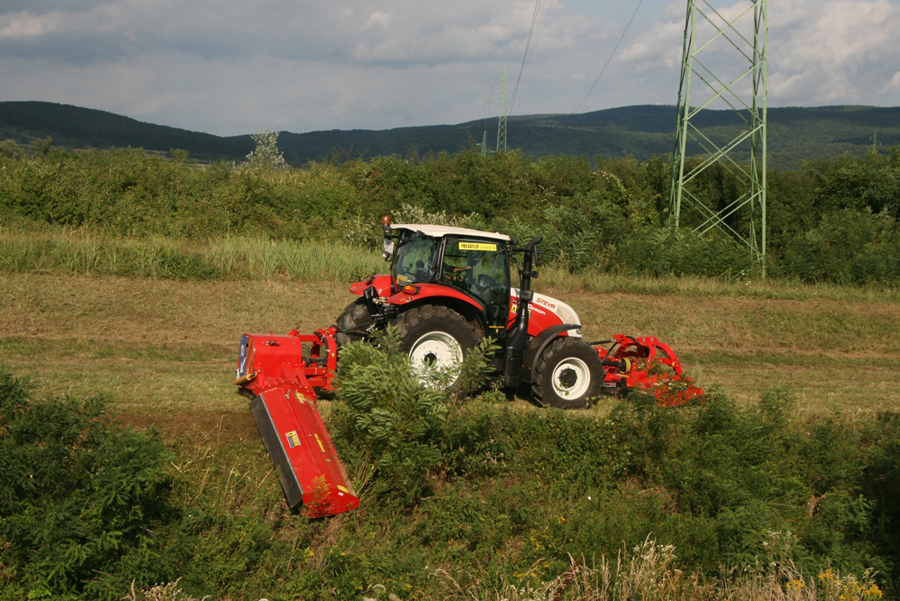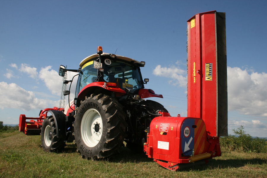Auf der Heckseite des Traktors befindet sich der Mulcher, einer der robustesten dieser Art – der SAV – in der größten Arbeitsbreiten seiner Klasse – 275 cm. Der “SAV” ist eine sehr robuste Maschine, die in der Lage ist, Gras und Sträucher mit einem Durchmesser bis zu 7 cm und ausgestattet mit einem Forstrotor bis zu 12 cm zu mulchen. Er besitzt die Fähigkeit sich an eine Geländeneigung von -65° bis 90° anzupassen, dank einer Hydrauliksteuerung und einer seitlichen Erweiterung, die stets hydraulisch ist.