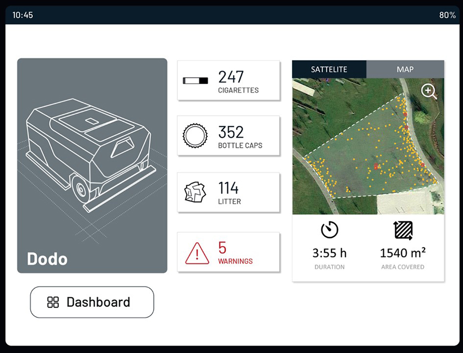 Über Kameras erkennen die Reinigungsmaschinen kleine Müllstücke und sammeln sie effektiv ein. Ein Filtersystem entfernt gezielt kleinsten Müll wie Zigaretten und sammelt sie separat. Dieser vollständig autonome Reinigungsprozess spart Zeit und Kosten. Dank KI-basierter Müll- und Hinderniserkennung arbeitet das Gerät effizient. Es läuft über Akkus und erreicht eine Reinigungskapazität von 500 bis 1.000 m2 pro Stunde – bis zu 30 Grad Steigung. Durch die KI erstellt die Maschine zudem Reinigungsberichte.