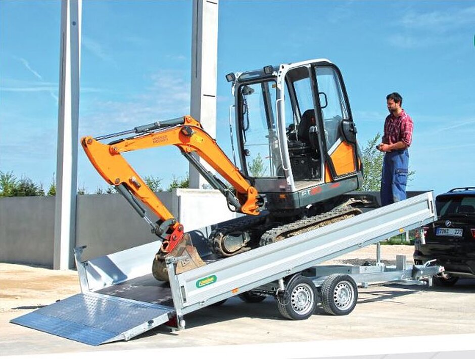 Sowohl die stabile Auffahrrampe für schwere Baugeräte, als auch die kraftvolle Elektro-Hydraulik mit Funkfernbedienung, für ein komfortables Bedienen, bieten eine durchdachte Lösung für den Einsatz im anspruchsvollen Außenbereich. Der UNSINN-Anhänger DUO ist in verschiedenen Gewichtsklassen und Größen erhältlich.