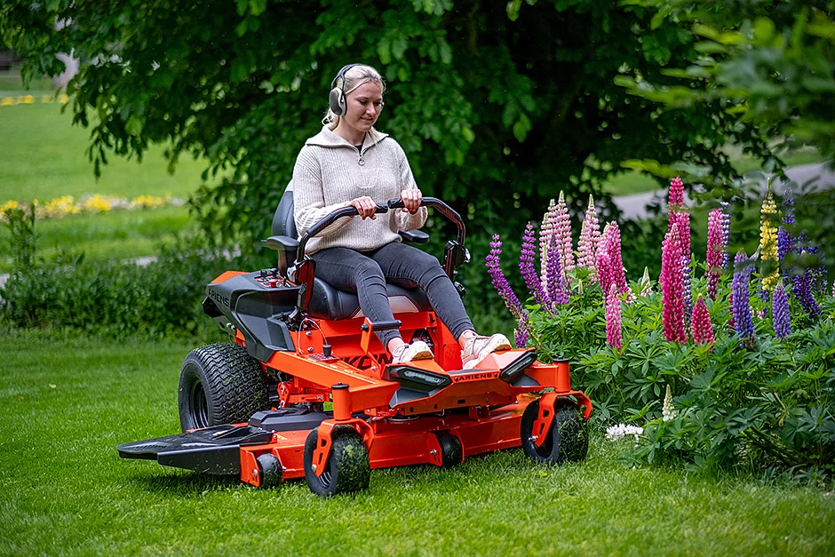 Dank ihres großen Durchmessers liegen die Fahrhebel gut in der Hand, und sie lassen sich werkzeuglos in vier Richtungen auf den Fahrer einstellen. Durch einfaches Ausklappen der Fahrhebel wird die Feststellbremse aktiviert. Eine von 13 möglichen Schnitthöhen (3,8 bis 11,4 cm) kann bequem vom Sitz aus per Magnetbolzen gewählt werden. Ebenfalls im Sitzen wird das solide Mähdeck einfach per Fußpedal ausgehoben. Die 20 Zoll großen Räder sorgen für einen hohen Federungskomfort, starke Traktion und geringen Bodendruck.