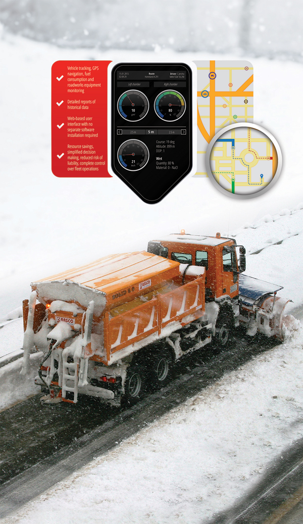 Für eine effektive Sommer- und Winterwartung der Verkehrsinfrastruktur mit einer sicheren, zuverlässigen, effizienten und einfachen Traktor- oder LKW-Erweiterung, ist auch ein Kontrollsystem und eine Ressourcenverwaltung des Fuhrparks erforderlich. RASCO bietet innerhalb seines Produktionsprogramms fortschrittliche, aber in der Anwendung einfache technologische Lösungen an, deren Nutzung eine Effizienzsteigerung und eine Senkung der Betriebskosten für die ganzjährige Wartung der Verkehrsinfrastruktur garantiert.