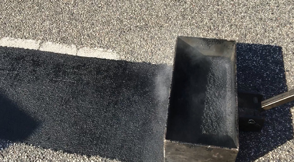 Vorteil bei dieser Variante: Es ist kein Fräsen, Schneiden oder Stemmen nötig. Die Flächen werden von losen Bestandteilen und Staub befreit und sie müssen trocken sein. Anschließend wird das Asphaltgranulat in einem Rührwerkskocher erwärmt. Dabei ist die Konsistenz ähnlich einem Mastix: fließfähig und mit einer hohen Klebkraft durch die Verwendung eines speziellen, polymermodifizierten Bindemittels. Durch seinen Anteil an Brechsand erreicht ASPA Repflex eine gute Griffigkeit der sanierten Schadstelle. Da die Korngröße auf zwei mm begrenzt ist, lässt sich das Produkt mit einem Ziehschuh in unterschiedlichen Breiten sehr dünn aufziehen – es entstehen keine Absätze oder Kanten. Oftmals kann die Fläche schon nach fünf Minuten wieder befahren werden.