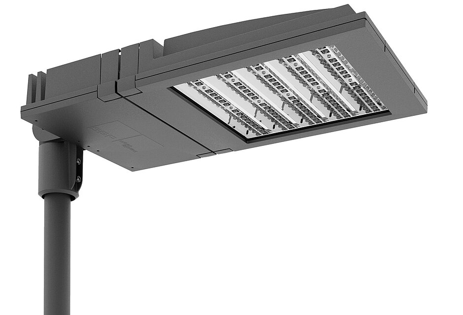 Die Straßenleuchte kommt dort zum Einsatz, wo eine sichere und gleichmäßige Beleuchtung gefragt ist. Das integrierte „Secure Light Distribution“-System verteilt das Licht über die gesamte zu beleuchtende Fläche ohne störende Schattenbereiche. Durch den speziellen Modul-Aufbau strahlt die LED auch bei Ausfall einzelner Dioden. Verkehrswege, größere Plätze oder Sportanlagen werden so weiträumig und zuverlässig ausgeleuchtet. Bei optimaler Anbringung (acht Meter Masthöhe, 7,50 Straßenbreite, 30 Zentimeter Mastabstand) entspricht die Leistung von 126 Watt der Beleuchtungsklasse ME3a für Wege mit motorisiertem Verkehr. Zum Vergleich: Herkömmliche Leuchtmittel wie Hochdruck-Natriumdampflampen erreichen diese Klasse erst bei einer Leistung von 169 Watt. Um den Energieverbrauch zusätzlich zu minimieren, senkt ein elektronisches Vorschaltgerät den Lichtstrom zu verkehrsschwachen Zeiten automatisch bis zu 50 Prozent. Die Elektronik erkennt die Zeitspanne zwischen dem Anschaltzeitpunkt und Mitternacht und reduziert die Intensität der Beleuchtung stufenweise über acht Stunden.