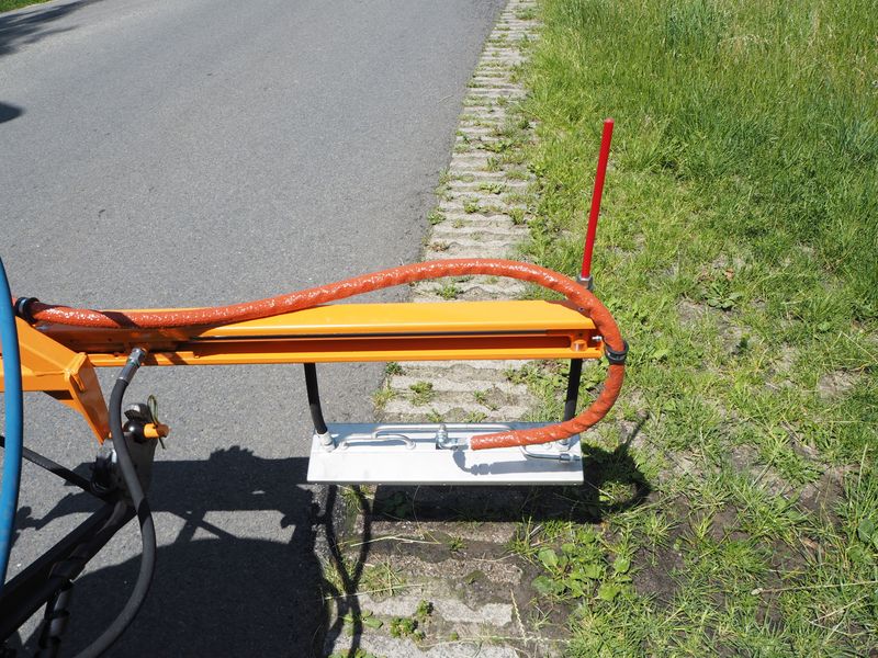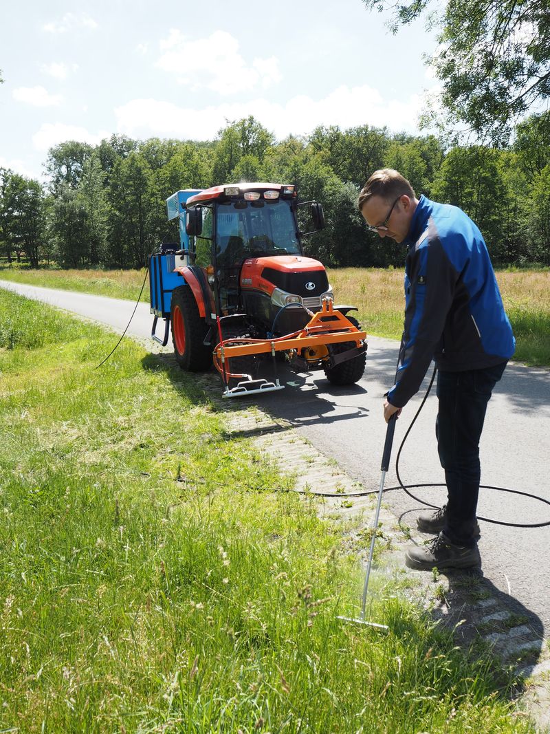 Die Aufbauweise ist dabei recht simpel: Am Rahmen der 3-Punkt-Aufhängung an der Front des Schleppers wird eine Unkrautdüse mit einer Arbeitsbreite von 300 mm und einem Gewicht von rund 35 kg befestigt. Für eine perfekte Justierung am Fahrbahnrand kann die Unkrautdüse über die Bedienung im Fahrerhaus hydraulisch bis zu 750 mm nach rechts verschoben werden.