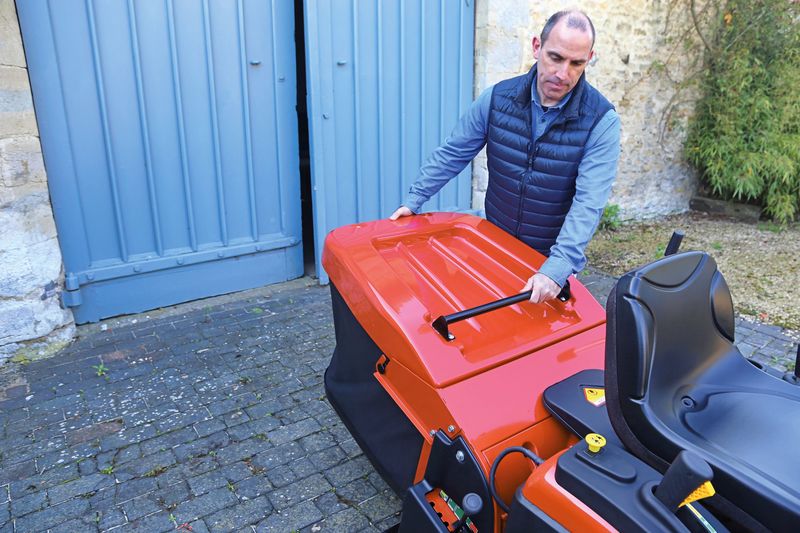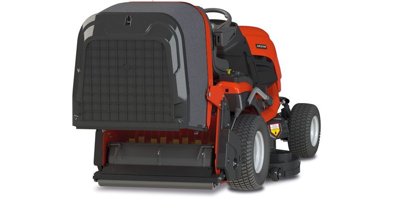 Ab sofort kann ohne Werkzeug, nur mit einer Münze oder einem Hausschlüssel, die Abdeckung des Antriebssystems geöffnet werden. So kann z. B. der Keilriemen stressfrei ein wenig justiert werden. Überhaupt ist das Anbauen der Rasenpflegemaschine jetzt schneller möglich und das Netz des Grasfangkorbs leichter anzubringen. Auch die Positionierung des Hebels für das Entleeren des Fangkorbs wurde verändert, und ein Tragegriff auf der Oberseite erleichtert das Manövrieren des Anbaugeräts. Dass die gesamte Konstruktion aufgrund von modernen Materialien dennoch weniger wiegt als bisher, ist reichlich beeindruckend.