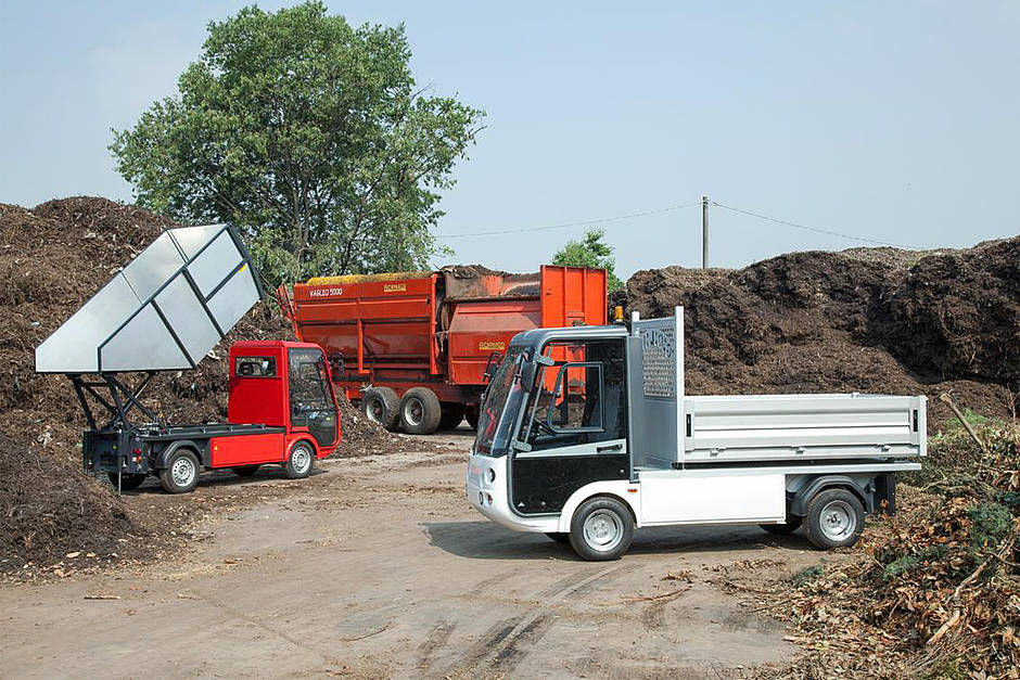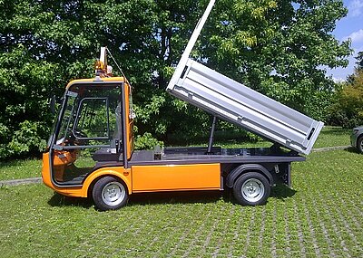 verschiedene Kippervarianten, Wasserfass, schaltbares Untersetzungsgetriebe vom Fahrersitz aus und vieles mehr, erweitert die Einsatzmöglichkeiten dieser Elektrofahrzeuge.