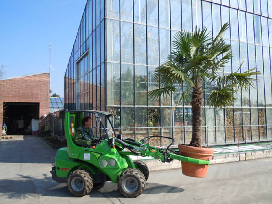 Der Multifunktionslader AVANT 528 bewegt sich schlangengleich durch meterhohe Palmen, die für die Winterzeit in einem Gewächshaus der Stadtgärtnerei Passau eingelagert sind. Sie zu transportieren, die teilweise einige hundert Kilogramm wiegen, ist eine wichtige Aufgabe für den AVANT 528. Die Stadtgärtnerei hatte einige technische Anforderungen an die neue Maschine, die zu erfüllen waren, damit sie in den Einsatz kommen konnte. So ist es außerordentlich wichtig, einen schmalen Multifunktionslader einzusetzen. Der AVANT 528 ist in seiner schmalsten Reifenausführung maximal 99 cm breit und hat eine maximale Höhe von 1,98 m.