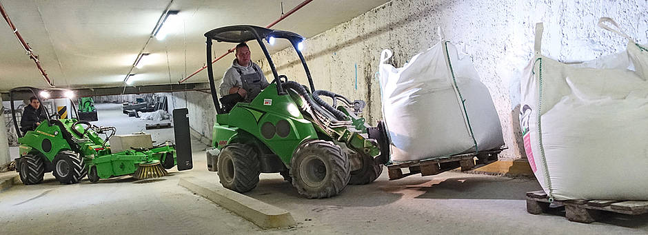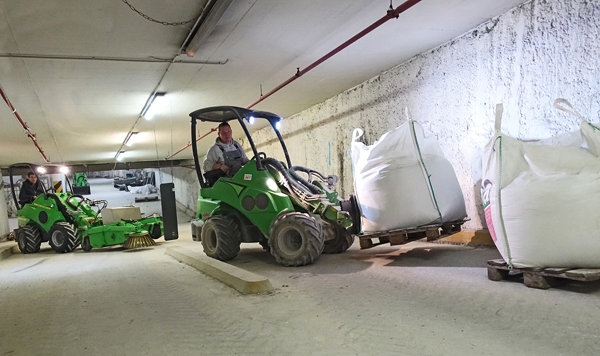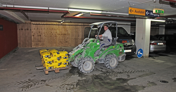 Der AVANT 635, mit einer Hubkraft von 1,1 Tonnen und einem Eigengewicht von 1380 kg ist hier ständig im Einsatz. Weitere Lader, ein AVANT 420 und ein AVANT 525 mit LPG-Gasantrieb, optimal für den Innenbereich Einsatz, unterstützen ihn dabei. Der abgefräste Bodenbelag wird per Ladeschaufel in ”bigpacks“ gefüllt, riesige Supersäcke von einem Kubikmeter Füllvolumen, die bis zu 1100 kg Material aufnehmen können. An den vier Schlaufen werden sie mit dem Lader auf Paletten transportiert, gesammelt, über die Geschosse nach oben an den Ausgang der Garage gefahren und in Container verladen. Allein im vierten Untergeschoss 48 Säcke Material. Auf dem gleichen Wege erfolgt auch die Anlieferung von einzubauendem Material mit dem AVANT 635. Die geringe Bauhöhe von 198 cm, kombiniert mit Kraft und Balance sichern hier eine sorglose An- und Ablieferung in den niedrigen Gängen der Tiefgaragen.