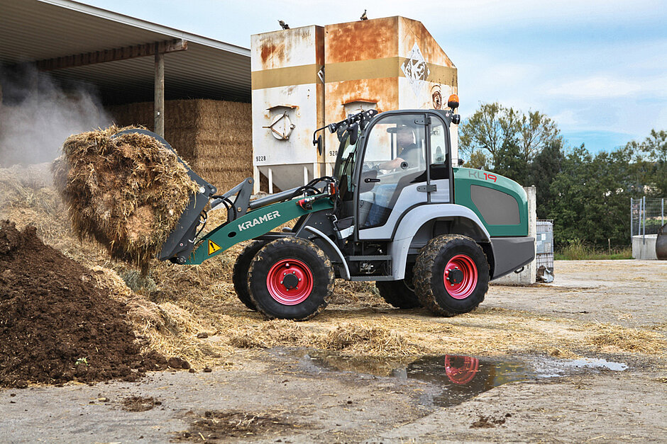 Die Kramer Maschinen können hier aufgrund ihrer hervorragenden Wendigkeit, die in Ställen und auf engen Höfen oft maßgeblich ist, bestens punkten. Diese resultiert aus der Allradlenkung mit einem Lenkeinschlag beider Achsen von jeweils bis zu 40°.