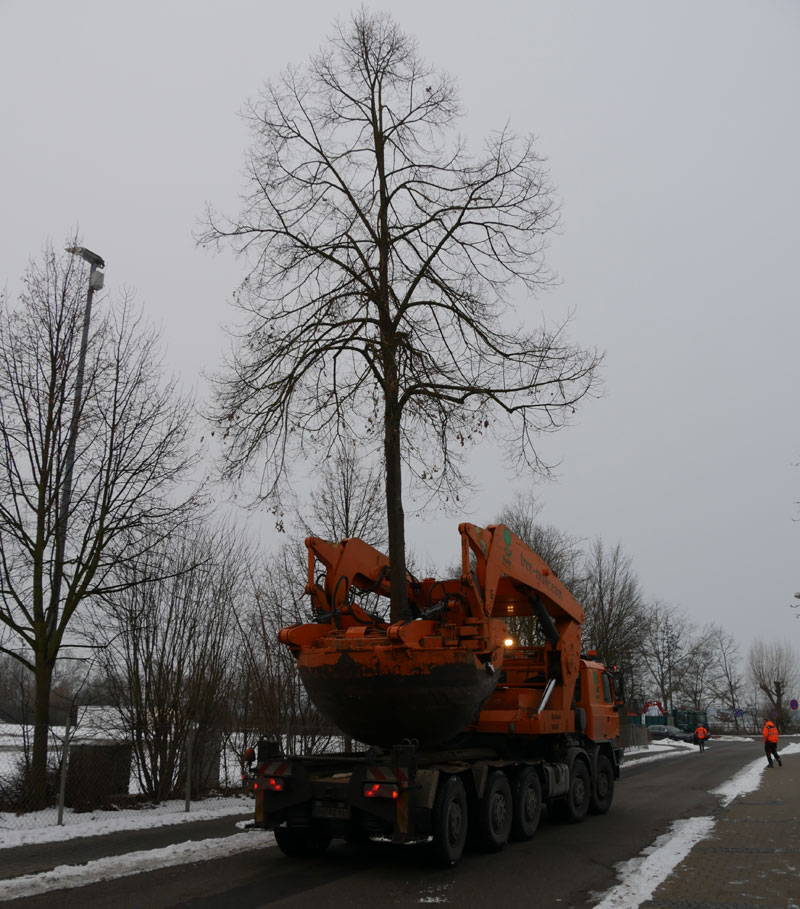 Die auf einem geländegängigen LKW montierte Maschine ermöglicht einen sicheren und schonenden Baumtransport, auch über längere Distanzen auf öffentlichen Straßen. Die sechs Linden bilden an der neuen Stelle neben dem Haus für Kinder farbenfroh zwei wunderschöne Baumgruppen und bieten für den Aufenthalt auf dem Spielplatz einen natürlichen Sonnenschutz.