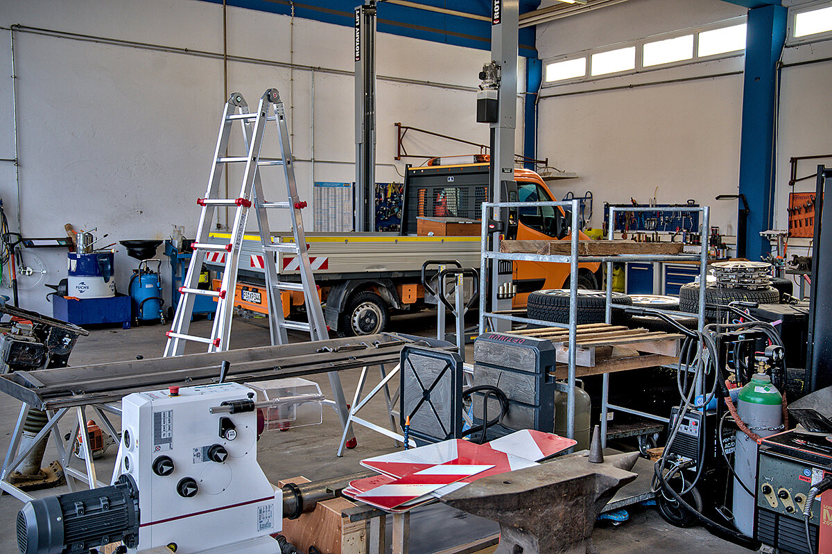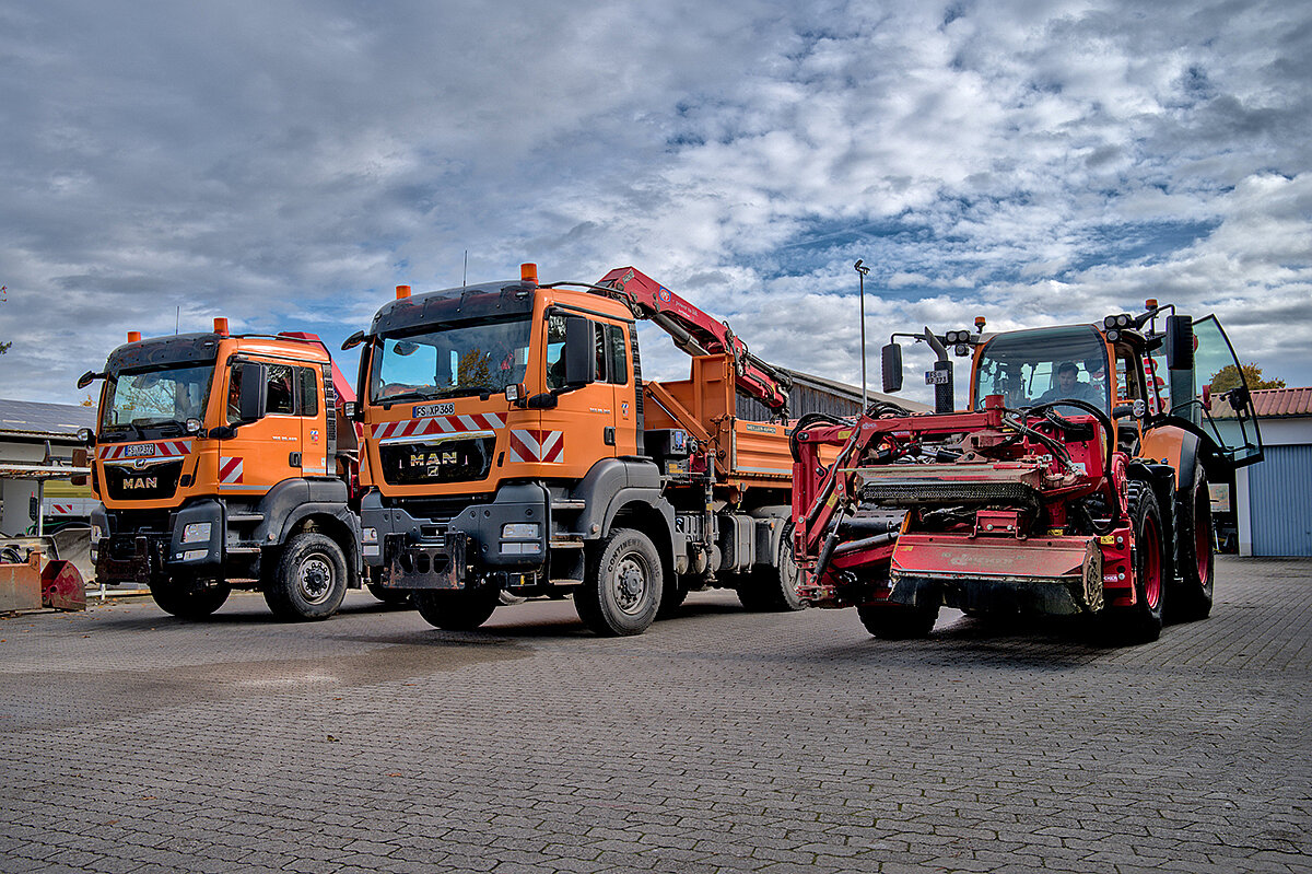 Maschinenportfolio: 2 Fendt-Traktoren für Mäharbeiten, 2 MAN Lkw mit Kran für Winterdienst, Unimog mit diversen Anbaugeräten, 3 Kastenwägen, 7 Fahrzeuge für Arbeitskolonnen, 2 Radlader, Mähraupe, diverse Kleingeräte u.a. von Stihl und Husqvarna