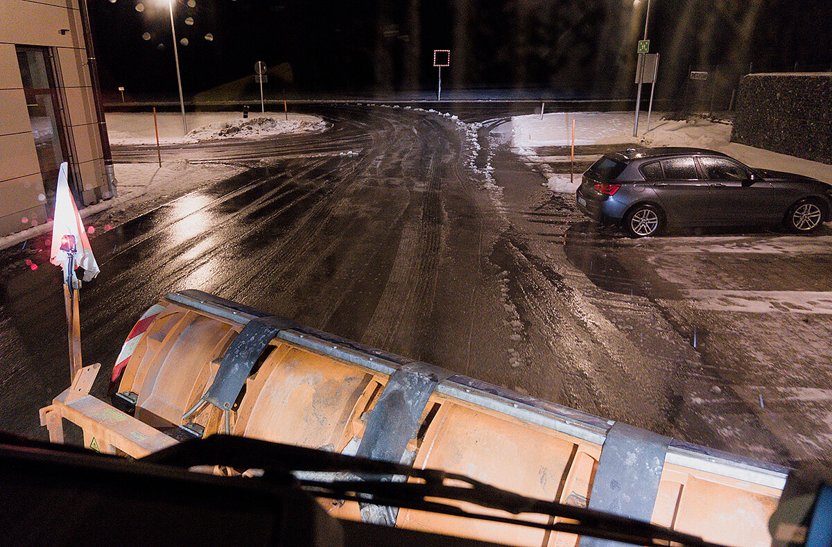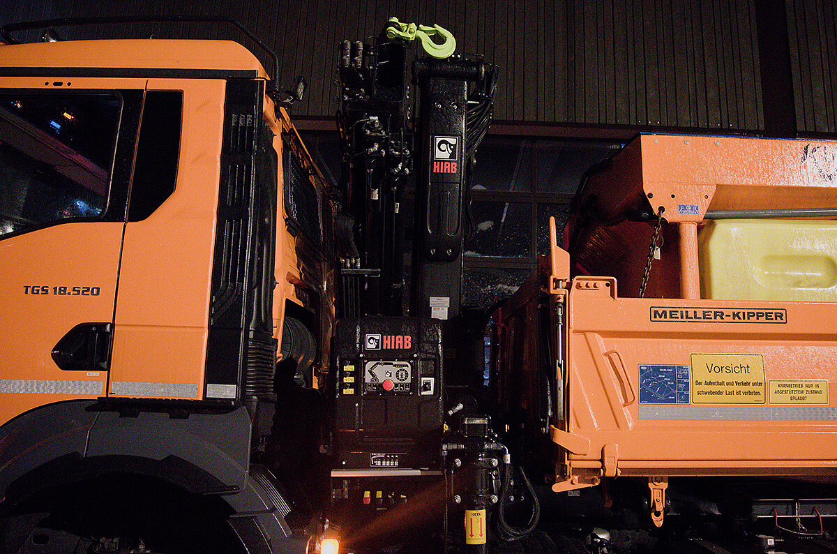 Am Bauhof im Stadtteil Engratsried fällt Nachtschicht-Leiter Gerhard Maier die Entscheidung darüber, ob in dieser Nacht geräumt werden muss, nicht schwer. Mit einem knappen „Du, wir müssen fahren!“ trommelt er drei weitere Mitarbeiter zusammen, und keine fünf Minuten später versammeln sich alle im Besprechungsraum – und das um drei Uhr in der Nacht. Trotz Müdigkeit ist die Stimmung unter den routinierten Mitarbeitern ausgelassen.