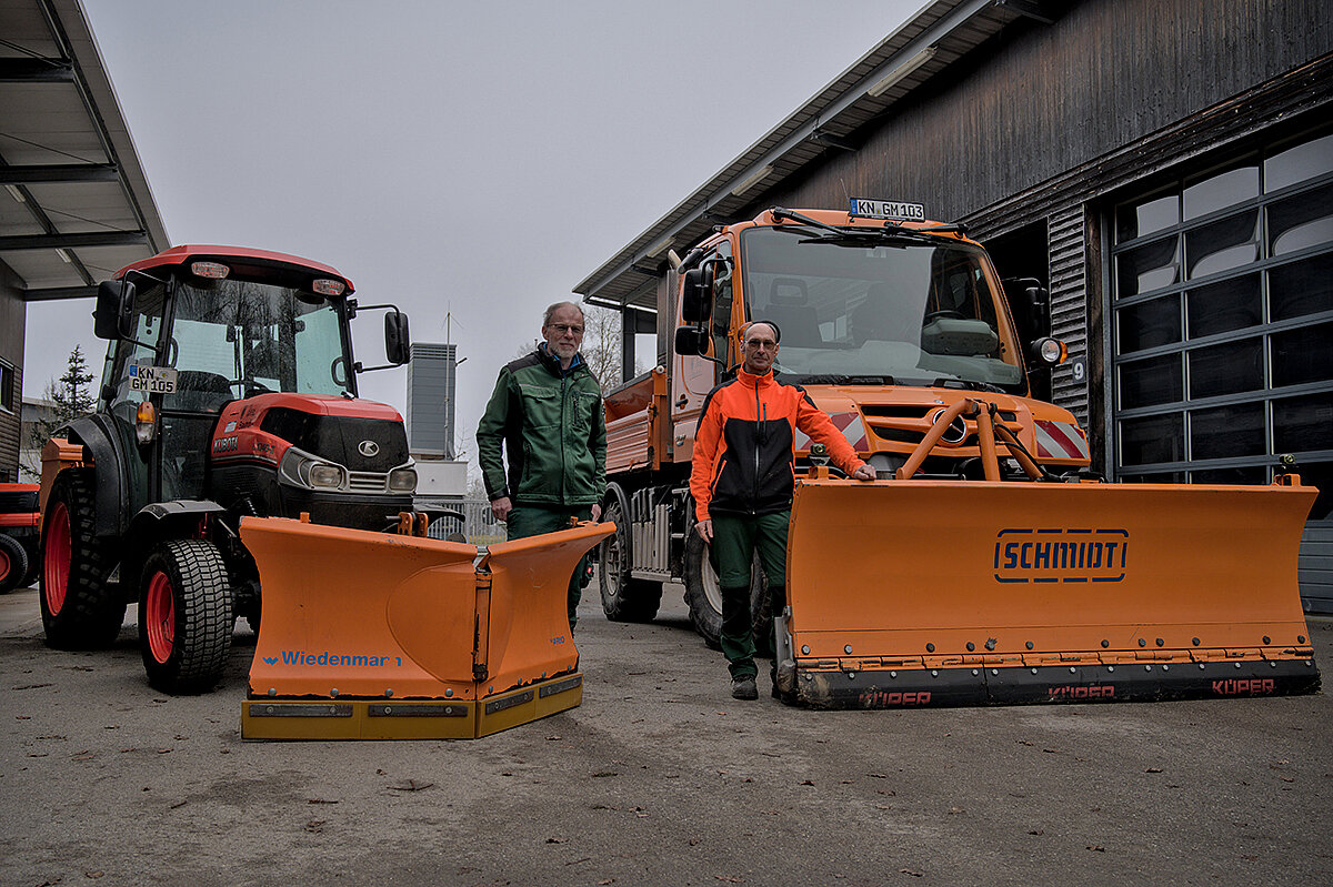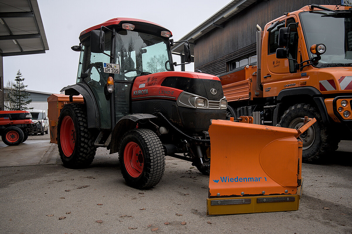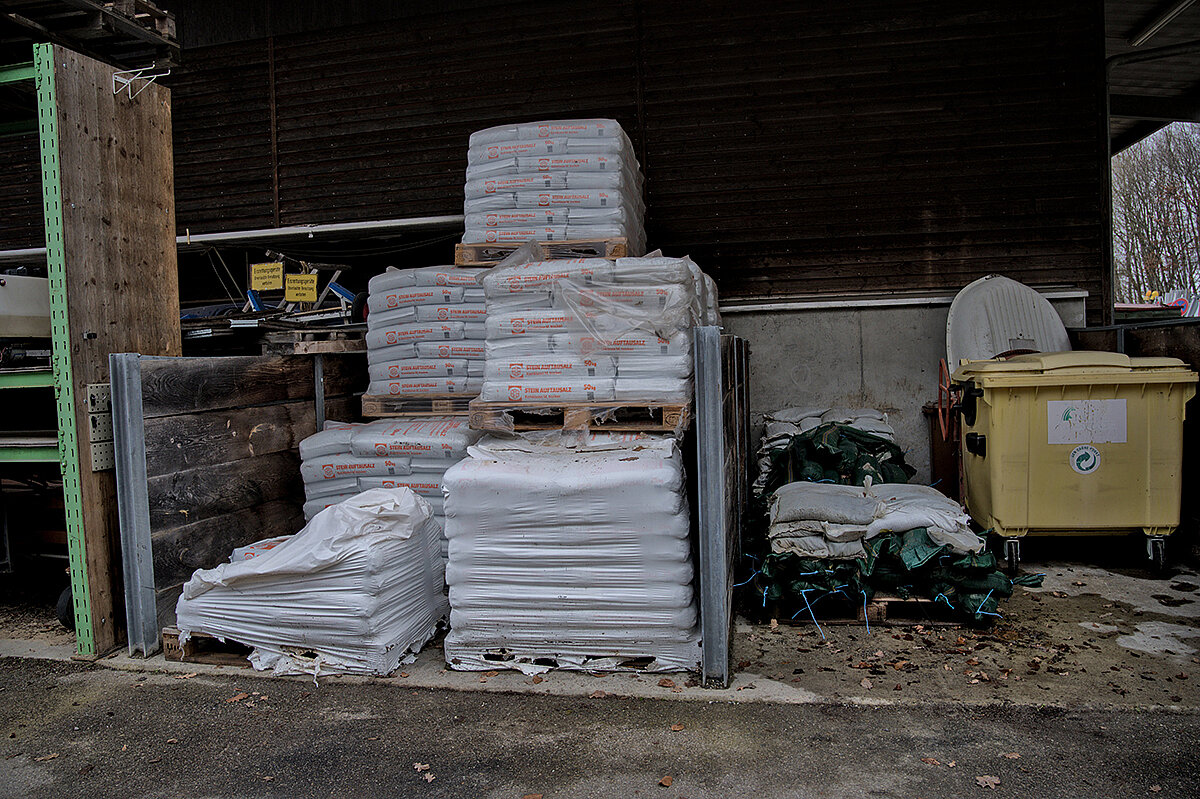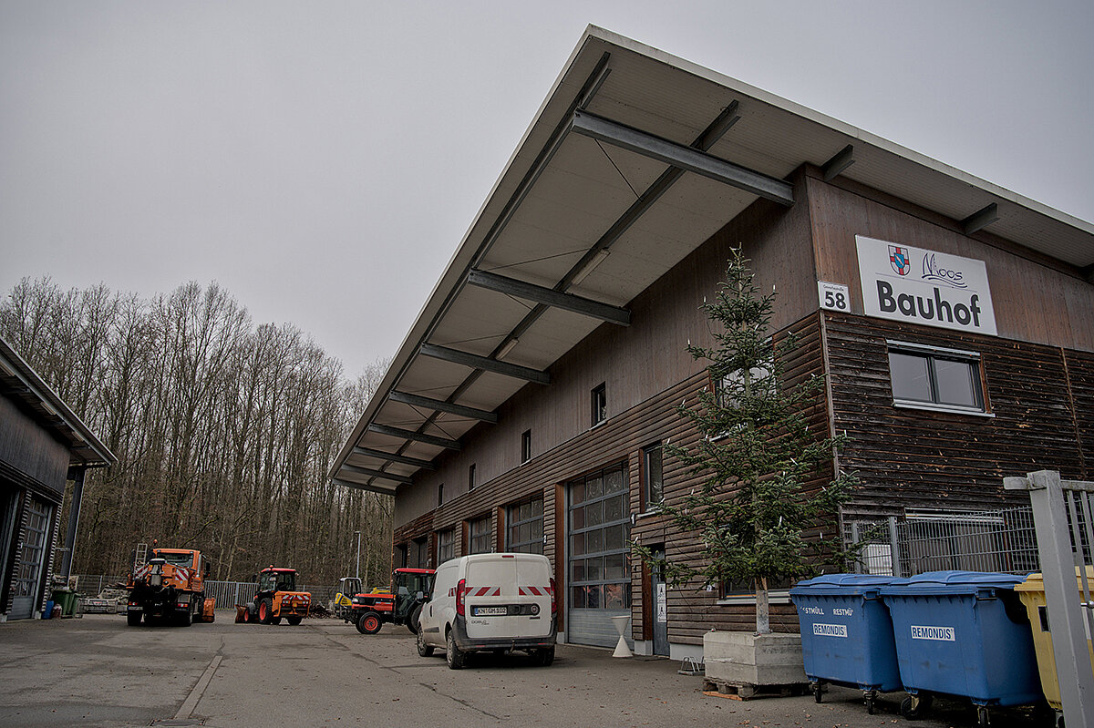 Ein offenes Tor und (fast) leere Maschinenhallen: Der Bauhof Moos wirkt wie ausgestorben, als Betriebsleiter Adrian Kofler gemeinsam mit seinem Stellvertreter Thomas Waibel über das Gelände führt. Aktuell sind die Mitarbeiter damit beschäftigt, Kleingehölze, Staudenbeete und Rosen zurückzuschneiden. Volles Programm für das Team, das in den vergangenen Monaten noch mit den letzten Aufräumarbeiten eines Hochwassers beschäftigt war. Ende August 2025 ist es hier zu einem Starkregen gekommen, bei dem 210 Liter Regen pro m2 gemessen worden sein sollen. Überschwemmungen waren die Folge. „Das Wasser ist hinter unserem Gelände kniehoch aus dem Wald geschossen“, erinnert sich Kofler. Er selbst sei an dem Tag im Urlaub gewesen, habe aber noch schnell auf dem Bauhof vorbeigeschaut, um nach dem Rechten zu sehen. Mit dem einsetzenden Starkregen und der Ausrufung der Notfallstufe wurden zusätzliche Mitarbeiter aus dem Urlaub zurückgeholt, um die Sicherungsarbeiten der Feuerwehr zu verstärken. Kofler zeigt einige Fotos, auf denen das Ausmaß der Überflutung deutlich wird: So ist der Unimog U318 des Betriebs im Einsatz zu sehen, der bis zur Radmitte im Wasser steht. „Ich war echt froh, dass die Maschine das so gut verkraftet hat“, schließt Kofler. Und die Aufräumarbeit der kommunalen Einsatzkräfte ist noch immer sichtbar: Auf dem Bauhof liegen weiterhin einige Trümmerreste, die das Team in den vergangenen Wochen beseitigt hat.