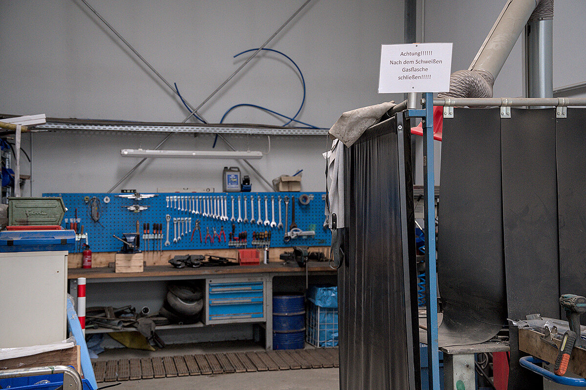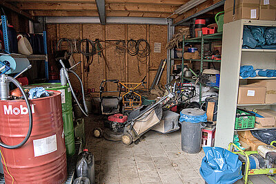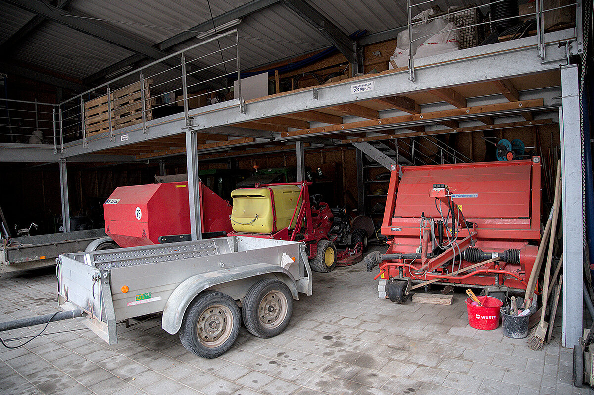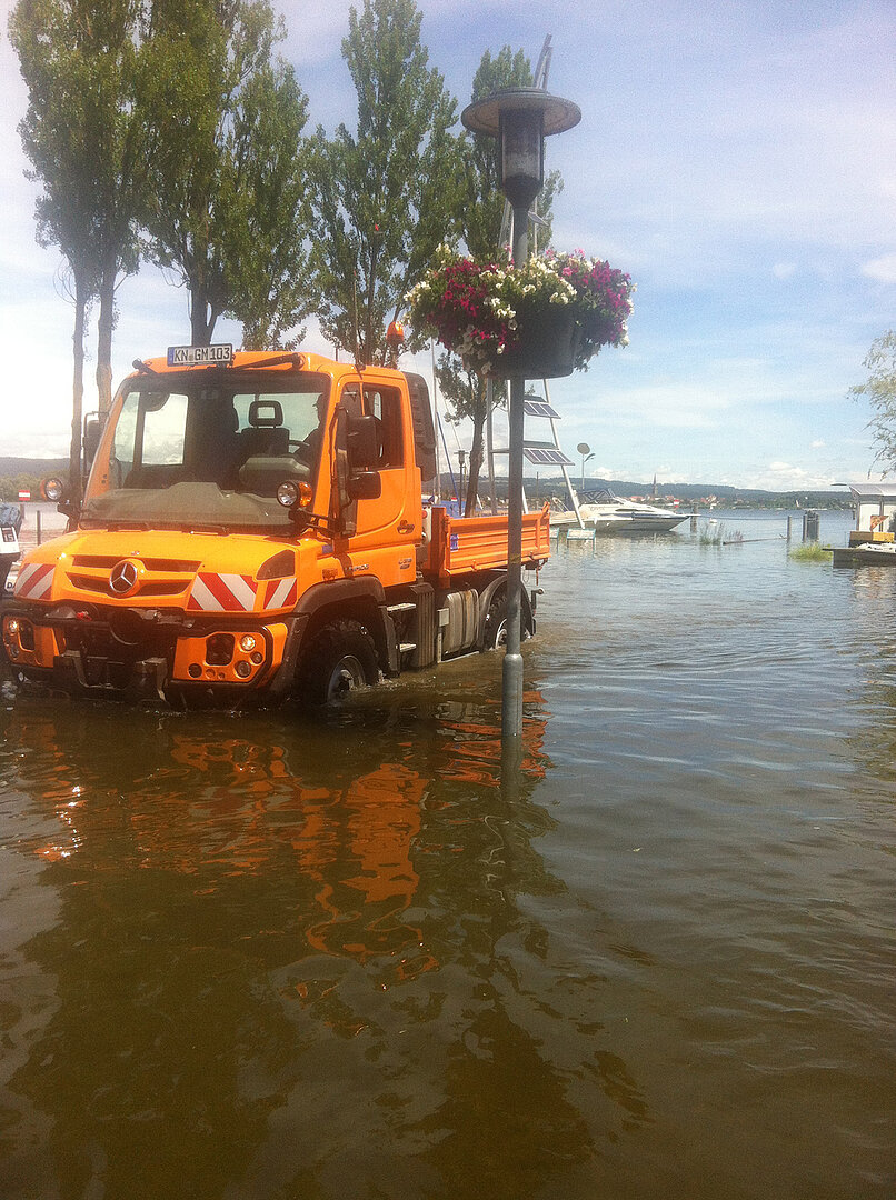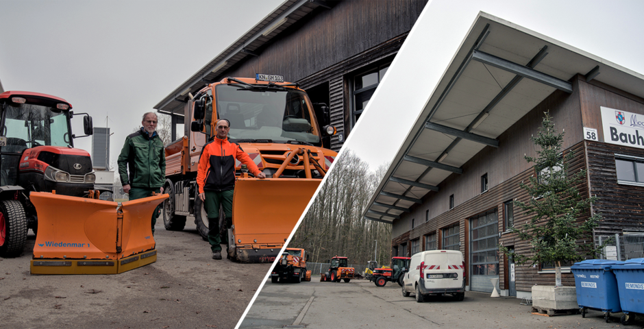 Ein offenes Tor und (fast) leere Maschinenhallen: Der Bauhof Moos wirkt wie ausgestorben, als Betriebsleiter Adrian Kofler gemeinsam mit seinem Stellvertreter Thomas Waibel über das Gelände führt. Aktuell sind die Mitarbeiter damit beschäftigt, Kleingehölze, Staudenbeete und Rosen zurückzuschneiden. Volles Programm für das Team, das in den vergangenen Monaten noch mit den letzten Aufräumarbeiten eines Hochwassers beschäftigt war. Ende August 2025 ist es hier zu einem Starkregen gekommen, bei dem 210 Liter Regen pro m2 gemessen worden sein sollen. Überschwemmungen waren die Folge. „Das Wasser ist hinter unserem Gelände kniehoch aus dem Wald geschossen“, erinnert sich Kofler. Er selbst sei an dem Tag im Urlaub gewesen, habe aber noch schnell auf dem Bauhof vorbeigeschaut, um nach dem Rechten zu sehen. Mit dem einsetzenden Starkregen und der Ausrufung der Notfallstufe wurden zusätzliche Mitarbeiter aus dem Urlaub zurückgeholt, um die Sicherungsarbeiten der Feuerwehr zu verstärken. Kofler zeigt einige Fotos, auf denen das Ausmaß der Überflutung deutlich wird: So ist der Unimog U318 des Betriebs im Einsatz zu sehen, der bis zur Radmitte im Wasser steht. „Ich war echt froh, dass die Maschine das so gut verkraftet hat“, schließt Kofler. Und die Aufräumarbeit der kommunalen Einsatzkräfte ist noch immer sichtbar: Auf dem Bauhof liegen weiterhin einige Trümmerreste, die das Team in den vergangenen Wochen beseitigt hat.