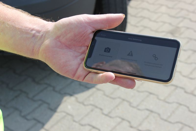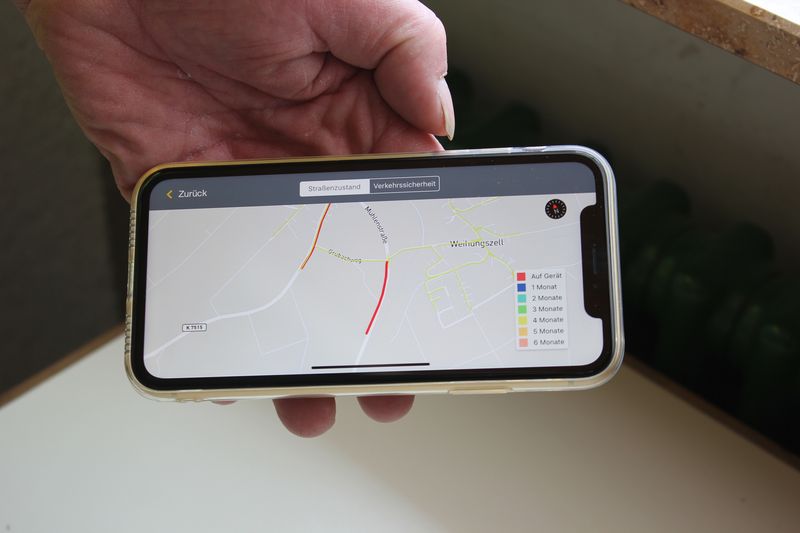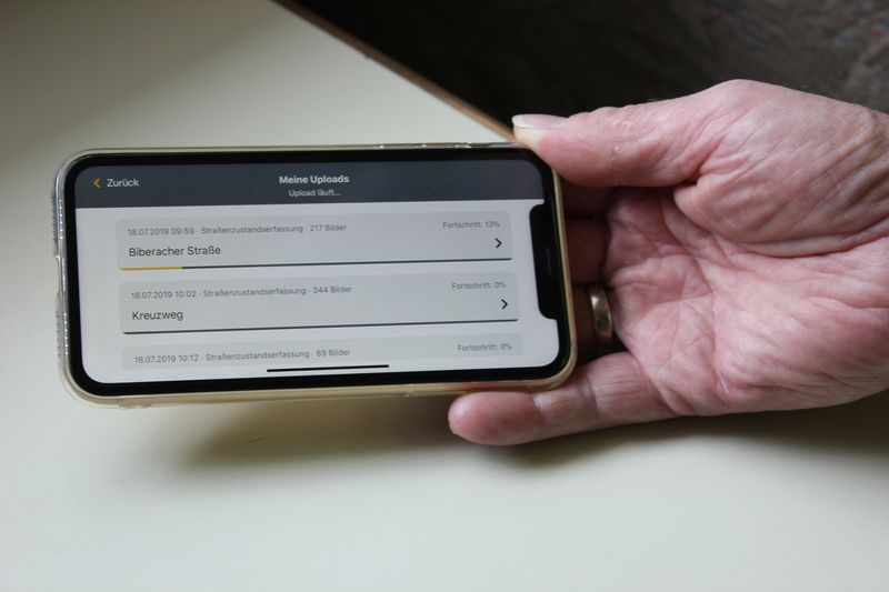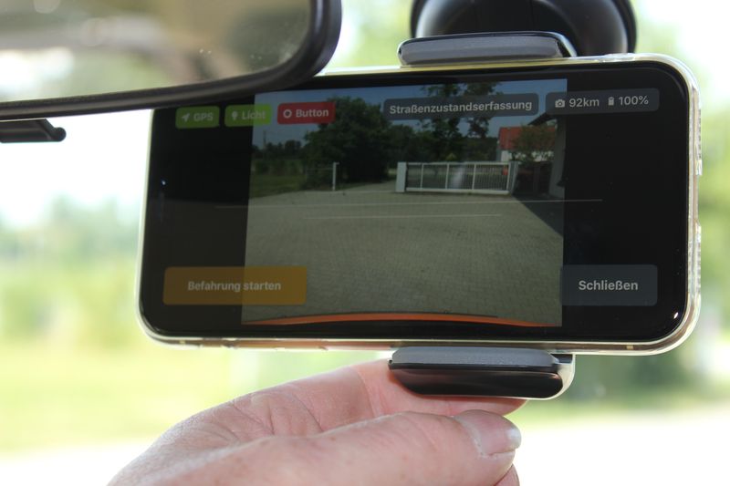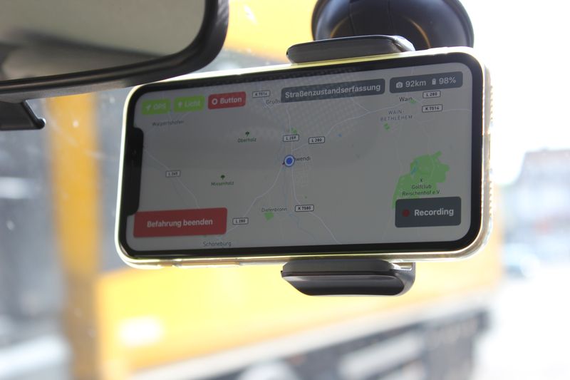 „Das System ist sehr intelligent“, sagt Schwendis Bauhofleiter, Reinhold Brehm. Das sollte es auch sein, denn immerhin sprechen die Stuttgarter Entwickler von künstlicher Intelligenz. Auf jeden Fall ist es recht einfach zu handhaben: Brehm schnappt sein Smartphone, steckt es in die Halterung an der Windschutzscheibe des Pritschenwagens – ähnlich jener von mobilen Navigationsgeräten –, richtet es über die „Wasserwaage“ des Handys aus, aktiviert die App, und los geht’s. Alle vier gefahrene Meter ist das Klicken der Kamera zu hören. Rund 80 Kilometer Ortsstraßen der 6.700-Seelen-Gemeinde erfasst Brehm mit dem vialytics-System: jedes Schlagloch, jeden Riss, jeden Schaden. Etwa zweieinhalb Arbeitstage benötigt der 50-Jährige, um den Ortskern Schwendi sowie die fünf weiteren Ortsteile Bußmannshausen, Großschafhausen, Orsenhausen, Schönebürg und Sießen im Wald (Hörenhausen und Weihungszell) bei Tempo 30 abzufahren. „Ich muss jede Sackgasse und jede kleine Siedlungsstraße extra anfahren, das ist sehr zeitintensiv“, schildert der Familienvater. Übrigens, das Straßennetz hat der Bauhof-Chef komplett im Kopf.
