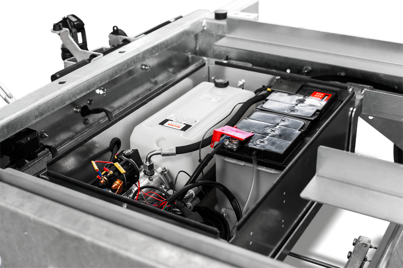 Die Profi-Serie bietet noch weitere Highlights. Die Oberbrücke ist noch massiver konstruiert. Sie sind die sichersten in ihrer Klasse: Die serienmäßige E-Hydraulik bietet eine Notausschalter und eine Nothandpumpe inklusive Ablassventil für ein sanftes Ablassen. Mit der neuen leistungsfähigen Batterie sind noch mehr Kippvorgänge als zuvor möglich (abhängig von Fahrzeuggröße und Zuladung). Bei dem Notausschalter handelt es sich um einen Batterietrennschalter, der auch Kriechstromverluste verhindert. Die magnetische Fernbedienung kann unkompliziert am Fahrzeug platziert werden. Serienmäßig verfügen diese Fahrzeuge über Winkelhebelverschlüsse und ein Schwerlast-Automatik Stützrad. Darüber hinaus sind die abschließbaren Schienenschächte bereits vorbereitet, sodass die Auffahrschienen von hinten einfach und unkompliziert entnommen und transportiert werden können.