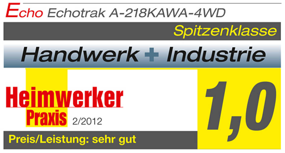 Das Testmagazin „Heimwerker Praxis“ hat den ECHOTRAK A-218KAWA-4WD mit Rasenpflegemaschine und Wiesen-Mulchmähwerk in seiner neuesten Ausgabe getestet und mit der Note 1,0 bewertet. Besonders gelobt wurde das reichhaltige Anbaugeräteprogramm, durch welches der ECHOTRAK das ganze Jahr rund um Haus und Garten genutzt werden kann.