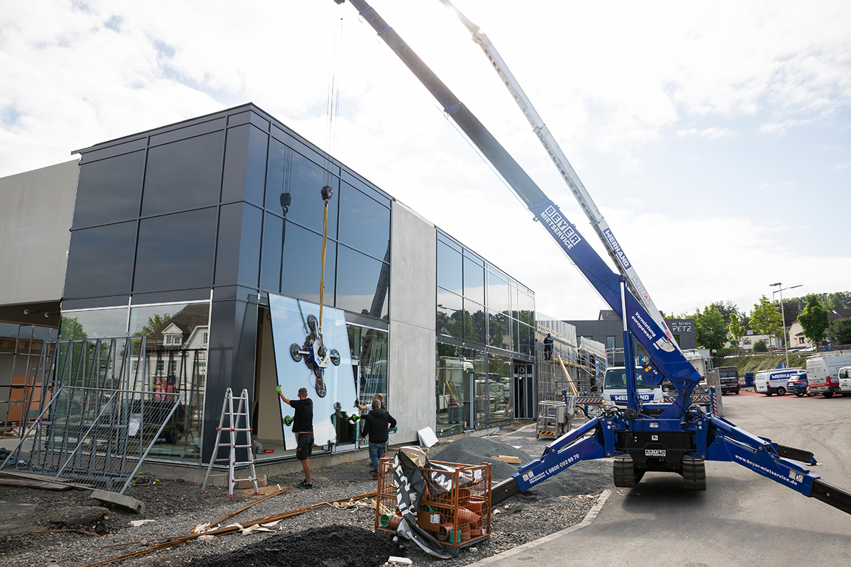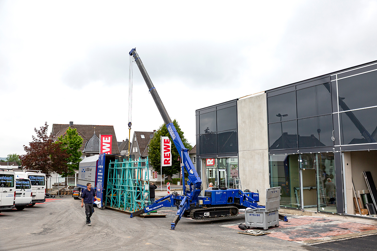 Da der laufende Kundenbetrieb während der Baumaßnahmen aufrechterhalten wurde, mussten sämtliche Arbeiten unter beengten Platzverhältnissen erfolgen. Durch seine kompakte Bauweise, die flexible Abstützung und den optionalen emissionsfreien Elektroantrieb eignete sich der eingesetzte Spinnenkran für diesen Einsatz unter herausfordernden Bedingungen.
