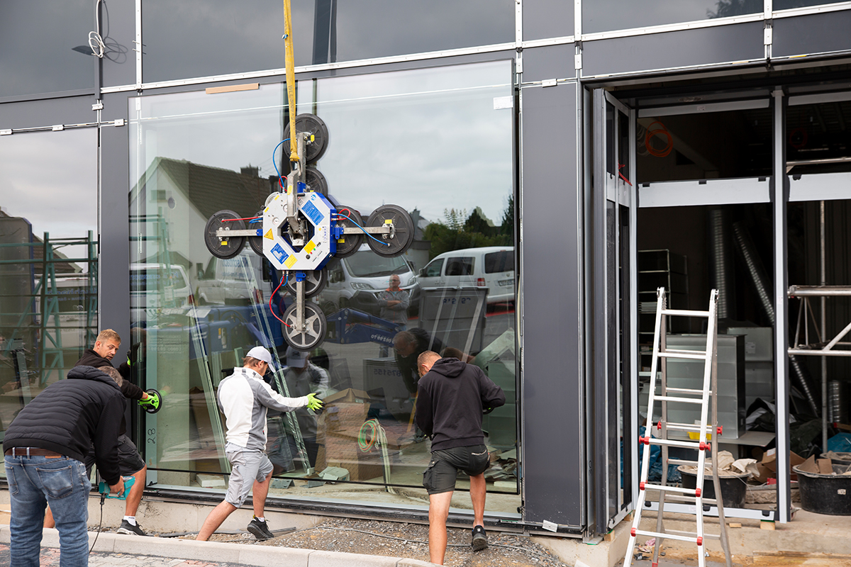 Das quadratische Großglas wurde per Innenlader angeliefert – die Aufnahme erfolgte unmittelbar vom Transportgestell aus. Für den schwingungsarmen Hub der empfindlichen Glaselemente wurden alle acht Saugteller angebracht, wodurch die maximale Tragfähigkeit sowie eine Saugfläche von 1,45 auf 1,45 Meter (1,90 Meter in der Diagonale) erreicht wurden.