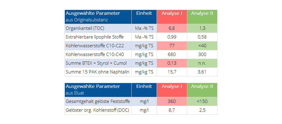 - Durch die Verbesserung der Eigenschaften erfolgt die Zuordnung in eine niedrigere Deponieklasse. Hieraus resultieren geringere Entsorgungskosten. Die sich ergebenden Einsparungen tragen zur Wirtschaftlichkeit des Unternehmens bei. Bei einem Kunden in Norddeutschland ist die Erzeugung von Recyclingbaustoff (Sekundärrohstoff) bereits erfolgreich etabliert.