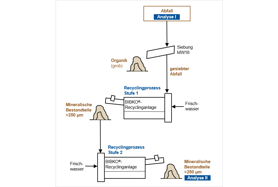 Zunächst wird ein Teil der (Grob-)Organik über ein Sieb abgeschieden. Im Anschluss erfolgt der zweistufige, nassmechanische Recyclingprozess in der Bibko-Infratec-Recyclinganlage. Vor dem Recyclingprozess liegen die Parameter teilweise über den Bestimmungswerten. Eine Nutzung als Ersatzbaustoff ist somit nicht möglich. Nach dem Recyclingprozess liegen alle Parameter in einem Bereich, der eine Nutzung als Recyclingbaustoff der Klasse 1 (RC-1) ermöglicht.